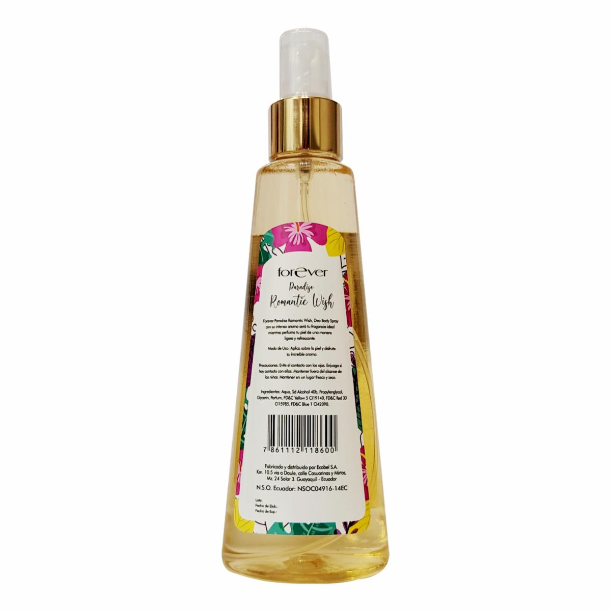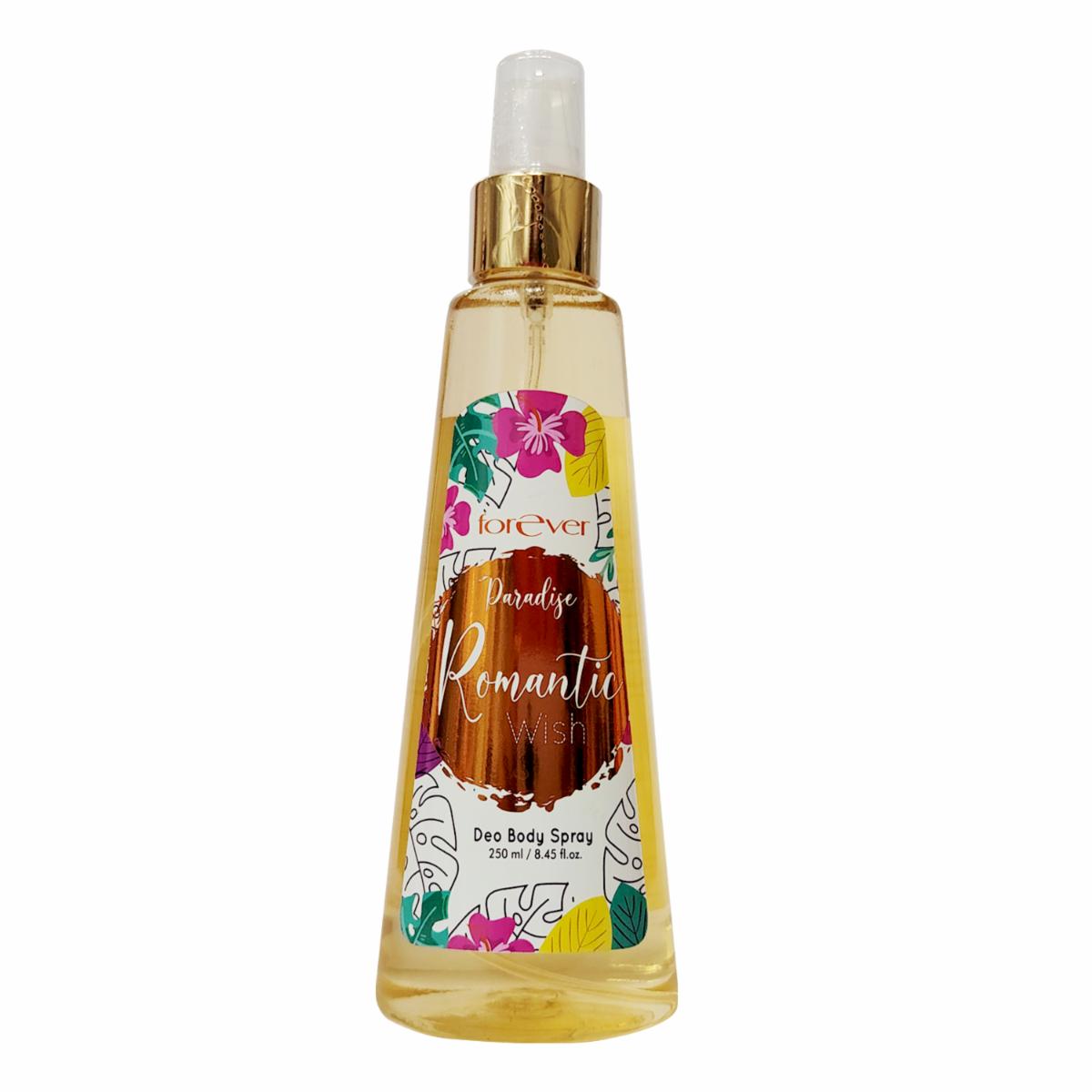 - Forever Body Splash Romantic Wish envuelve la piel con una fragancia dulce y romántica, perfecta para momentos especiales y el día a día