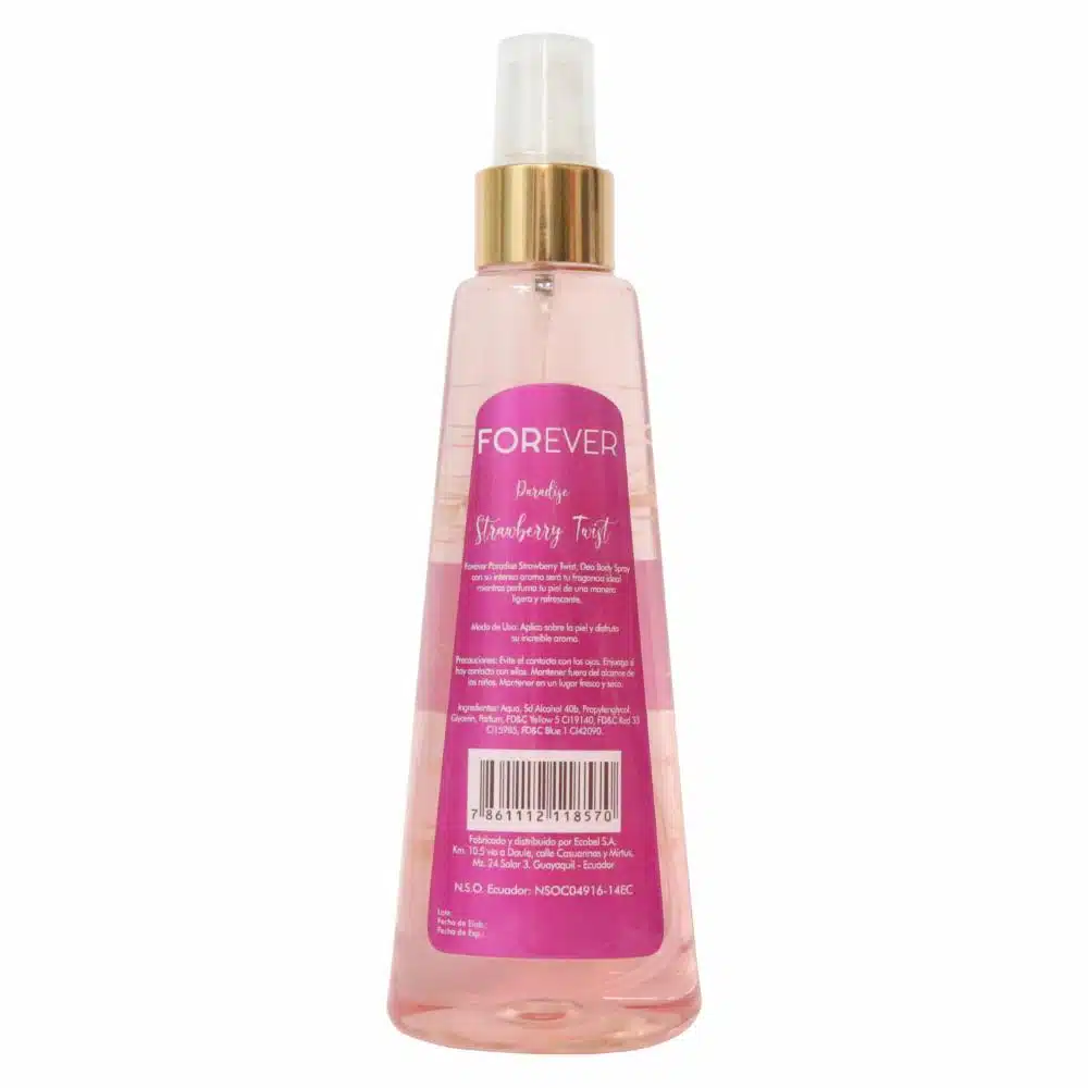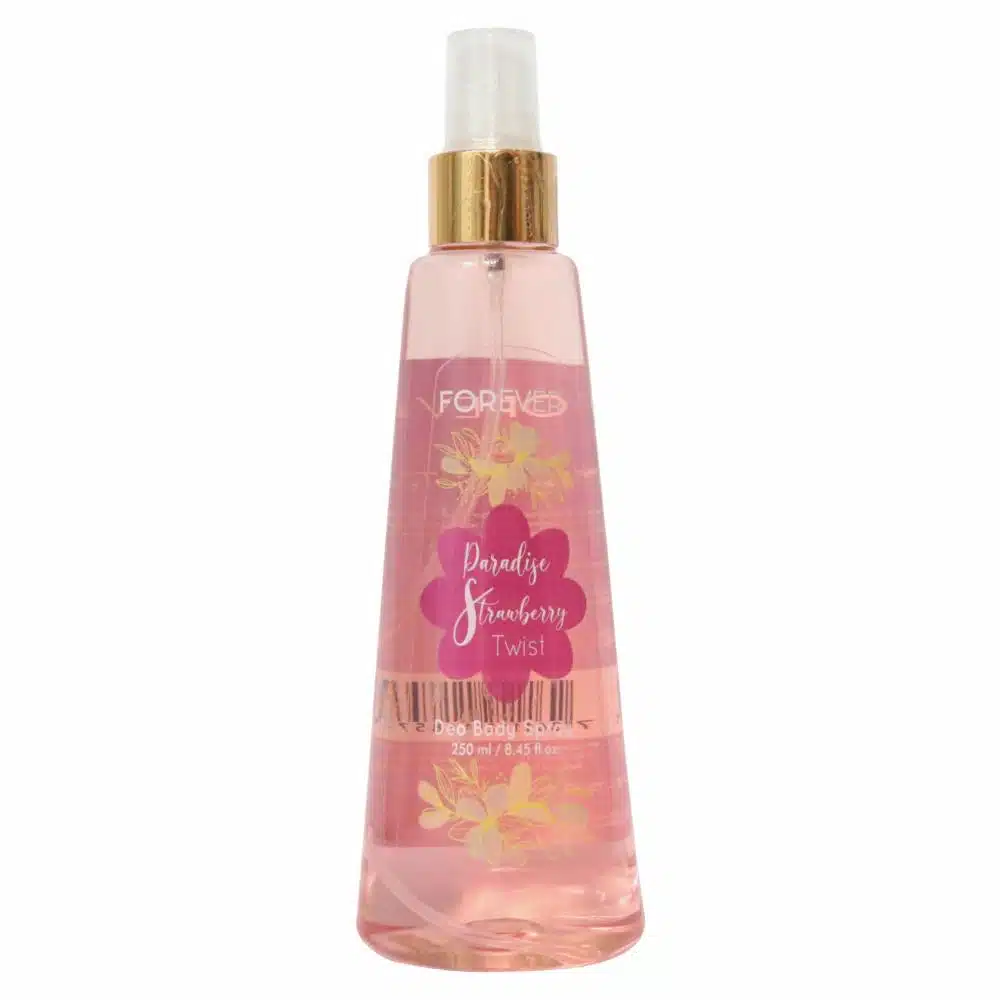 • Forever Body Splash Strawberry Twist ofrece una fragancia fresca y frutal, con notas jugosas de fresa que refrescan y alegran tu día