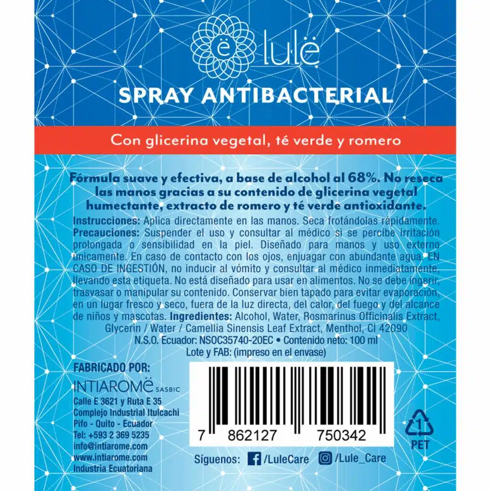 Spray Antibacterial Para Manos No Reseca LULË 100 Ml