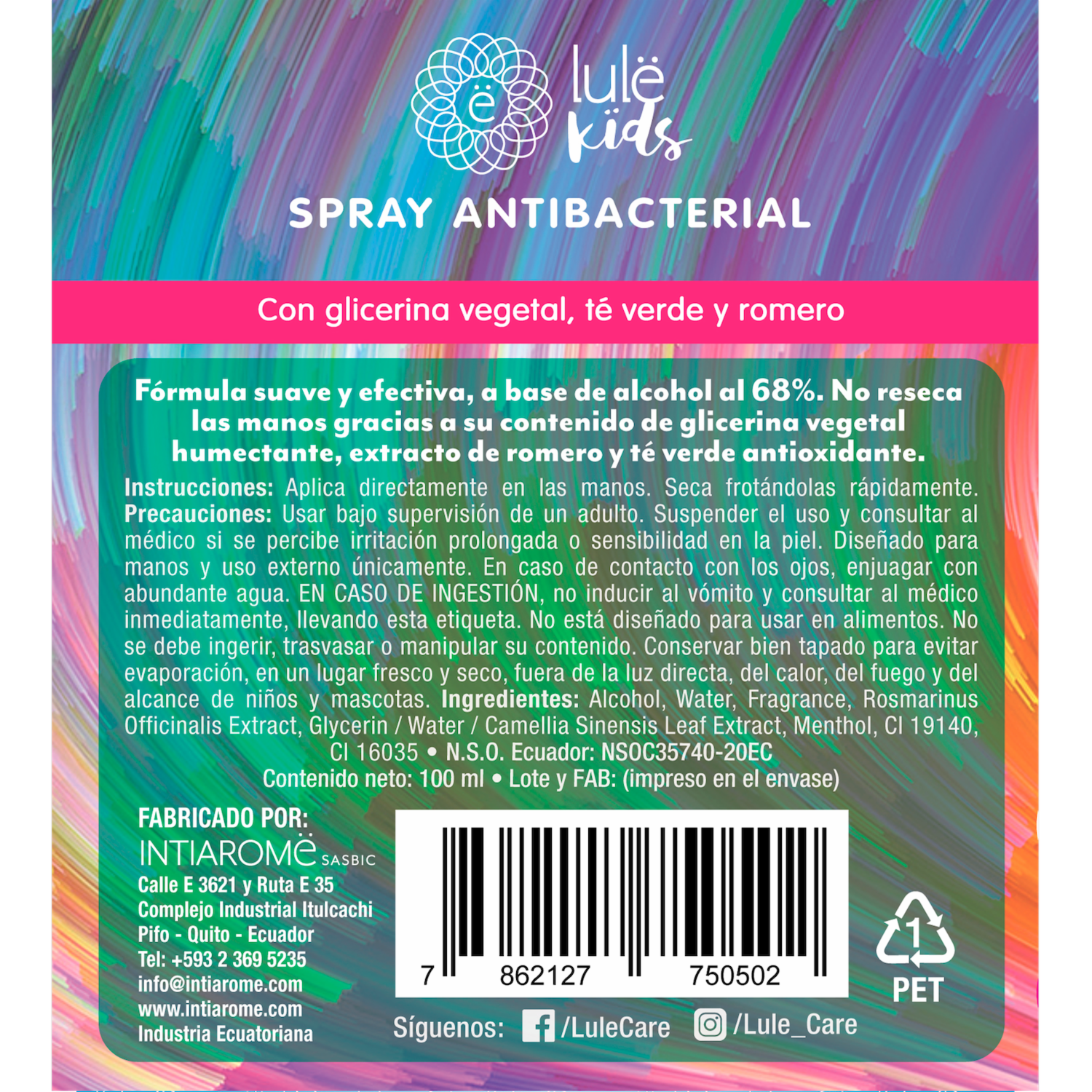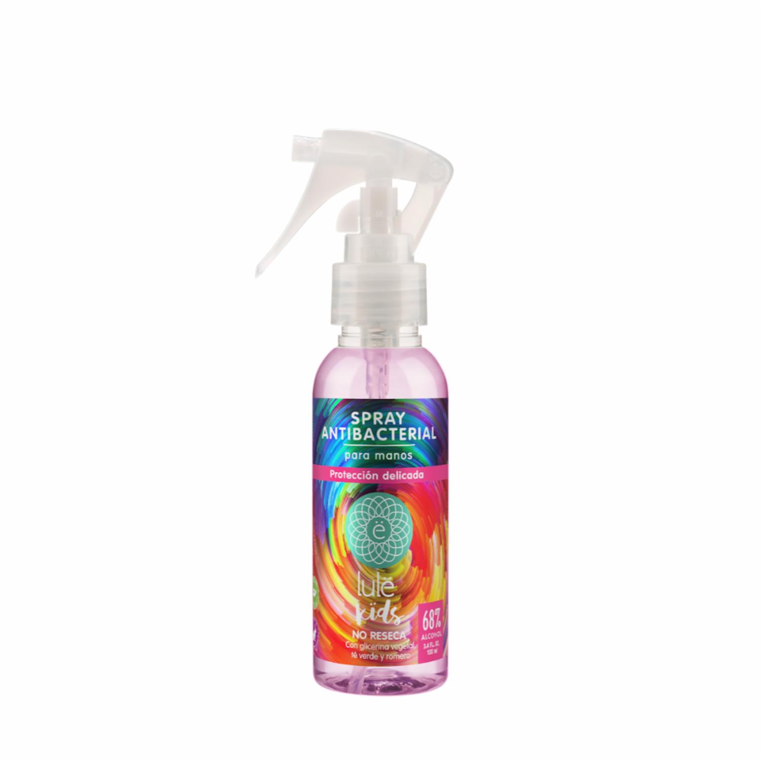 - Spray Antibacterial LULË KIDS 100 ml, con un delicado toque a fragancia súper suave, algo dulce, ideal para niños. Envase recargable ideal para viajes. Fórmula vegana, pH neutro, a base de alcohol al 68% para usarlo en manos y más, con glicerina vegetal como humectante para usar varias veces al día sin resecar. Con extracto de té verde como antioxidante y romero como antibacterial