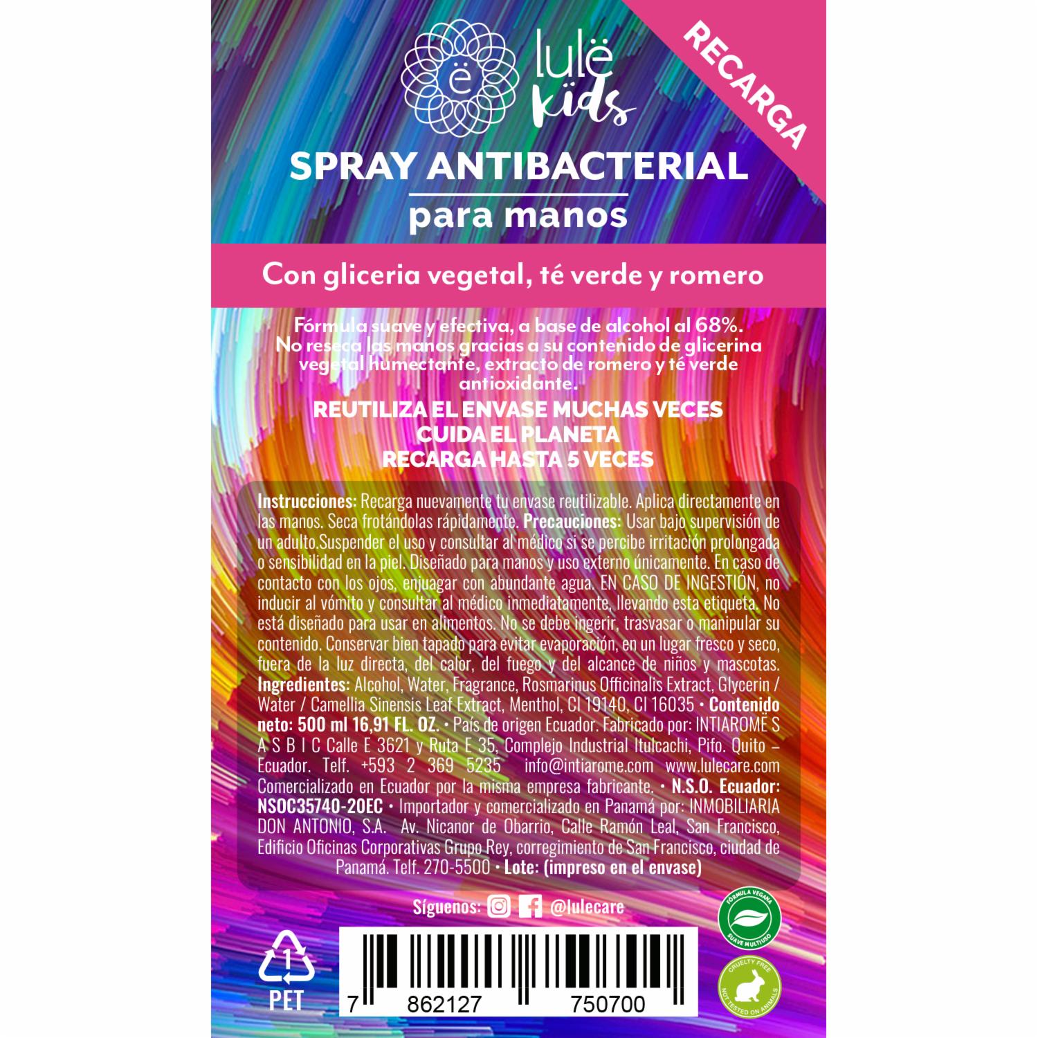 - Recarga x 5 Spray Antibacterial LULË KIDS 500 ml, con un delicado toque a fragancia súper suave, algo dulce, ideal para niños, envase reciclable. Fórmula vegana, pH neutro, a base de alcohol al 68% para usarlo en manos y más, con glicerina vegetal como humectante para usar varias veces al día sin resecar. Con extracto de té verde como antioxidante y romero como antibacterial