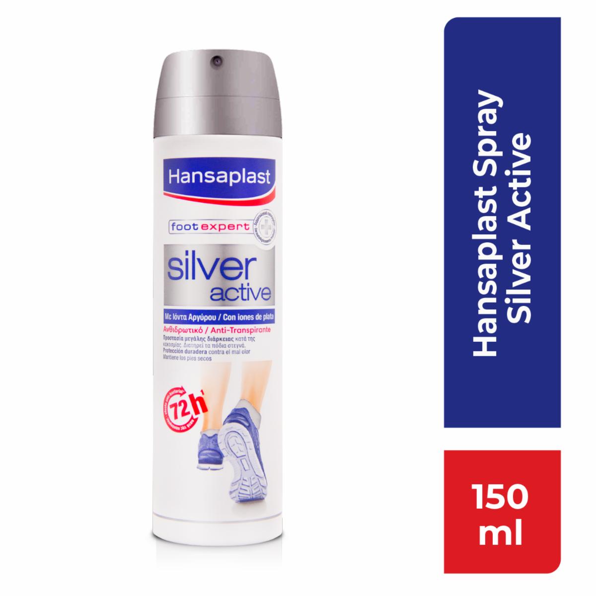 - El Spray de Pies Silver Active Hansaplast es un producto de cuidado podológico presentado en un práctico envase en aerosol de 150 ml. Está especialmente formulado para ayudar a mantener los pies frescos, secos y libres de malos olores. Su fórmula contiene ingredientes que ayudan a controlar el exceso de humedad en los pies, reduciendo así la probabilidad de irritaciones y el crecimiento de bacterias causantes del mal olor