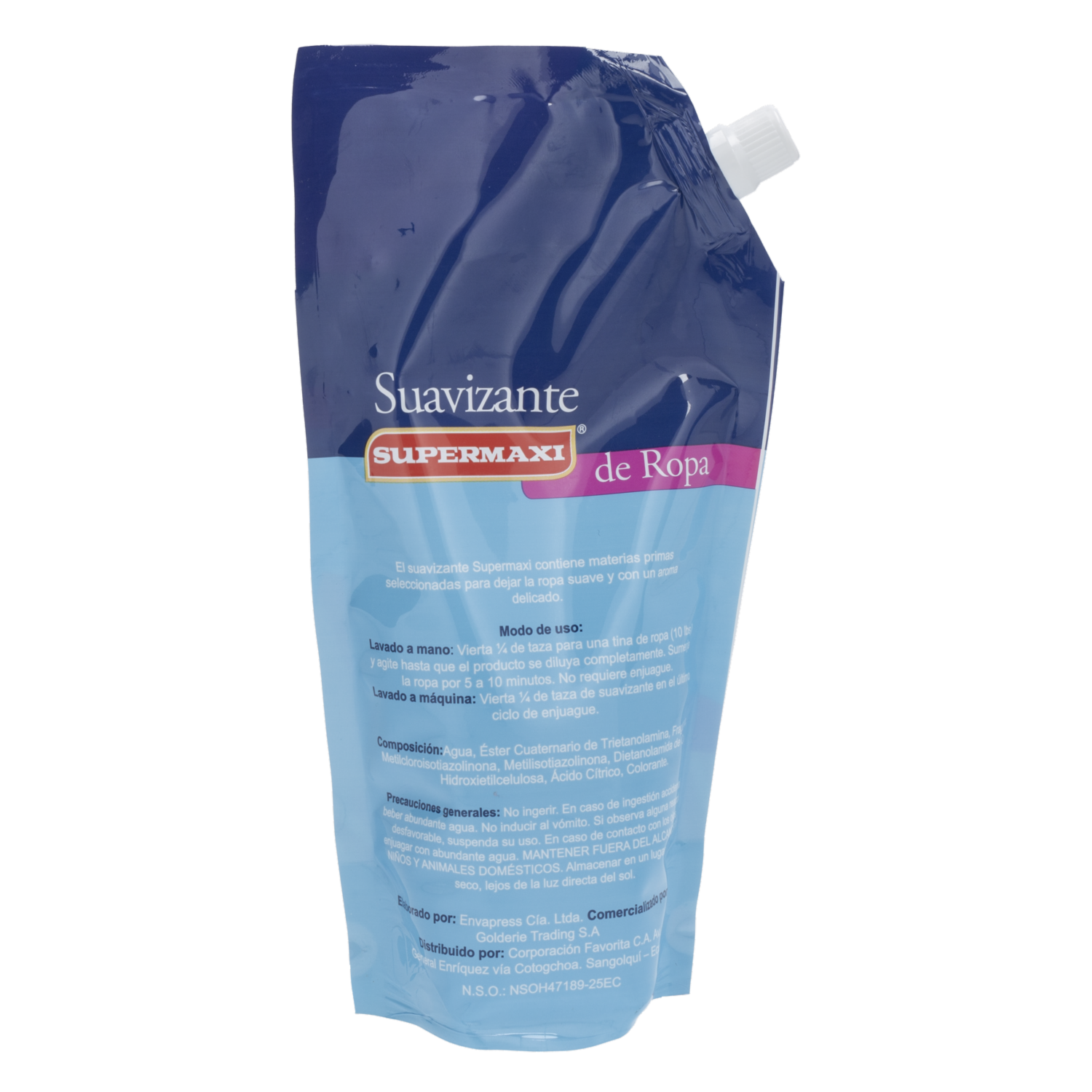 - El suavizante de telas clásico Supermaxi cuida tu ropa en cada lavado, dejándola increíblemente suave y con una fragancia agradable y delicada que perdura. Su fórmula líquida ayuda a mantener las fibras en buen estado, aportando una sensación de frescura y confort en cada prenda. Ideal para todo tipo de ropa, es perfecto tanto para lavado a mano como en lavadora. Su práctico envase doypack facilita el uso diario y ofrece una solución eficiente y accesible para el cuidado de tus telas