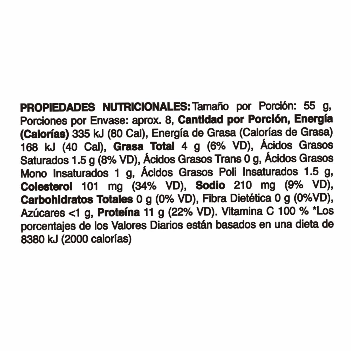 Azúcar, Sal, Carboximetilcelulosa). Contenido Neto 425 g. Peso Drenado 280 g CONTIENE PESCADO, RICO EN FOSFORO, se debe conservar en lugar fresco y seco. Una vez abierto cambiar envase y refrigerar