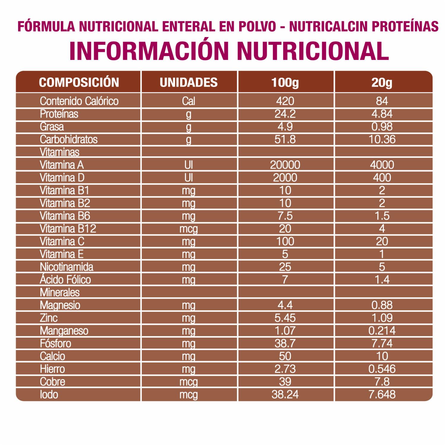 • Nutricalcin Proteínas es un suplemento nutricional en polvo que brinda energía y vitalidad, es muy completo e ideal para toda la familia, ayuda a recuperar esos nutrientes necesarios que el cuerpo necesita para un mejor desarrollo fisico e intelectual aportando energias y fortaleciendo el sistema inmunologico