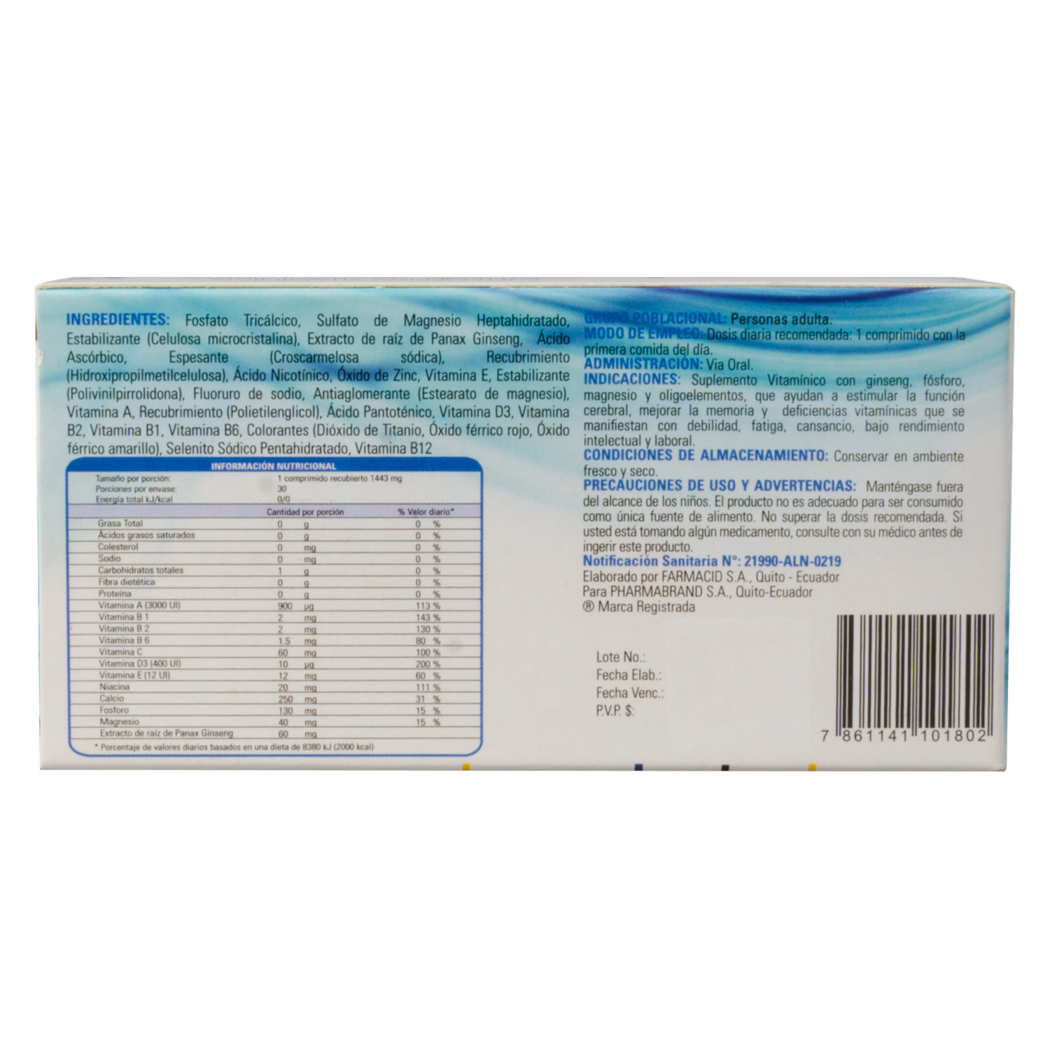 - Suplemento vitamínico que ayuda a potenciar la memoria, concentración y estimula la agilidad mental. Formula especializada con Ginseng, Fósforo, Magnesio