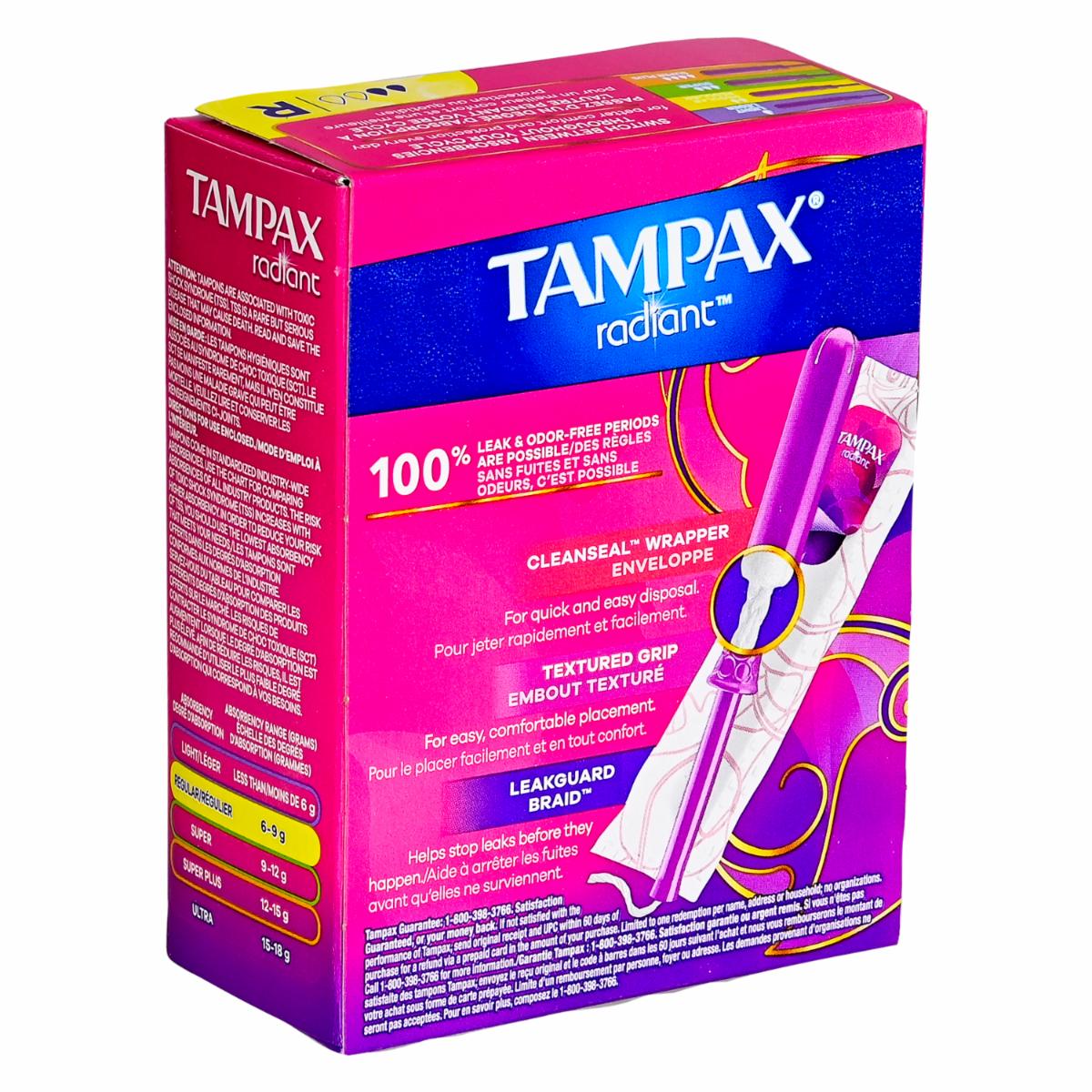 - Es un nuevo momento para esa época del mes. Obtenga hasta un 100% de protección contra fugas y sin olores con los tampones Tampax Radiant diseñados con LeakGuard Braid para ayudar a detener las fugas incluso antes de que ocurran. Para una protección con la que puedas sentirte bien