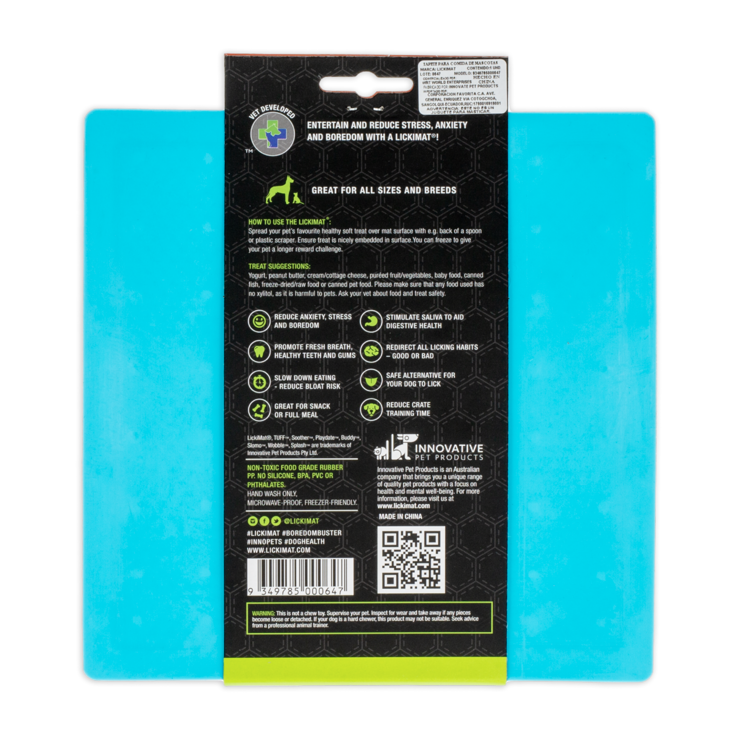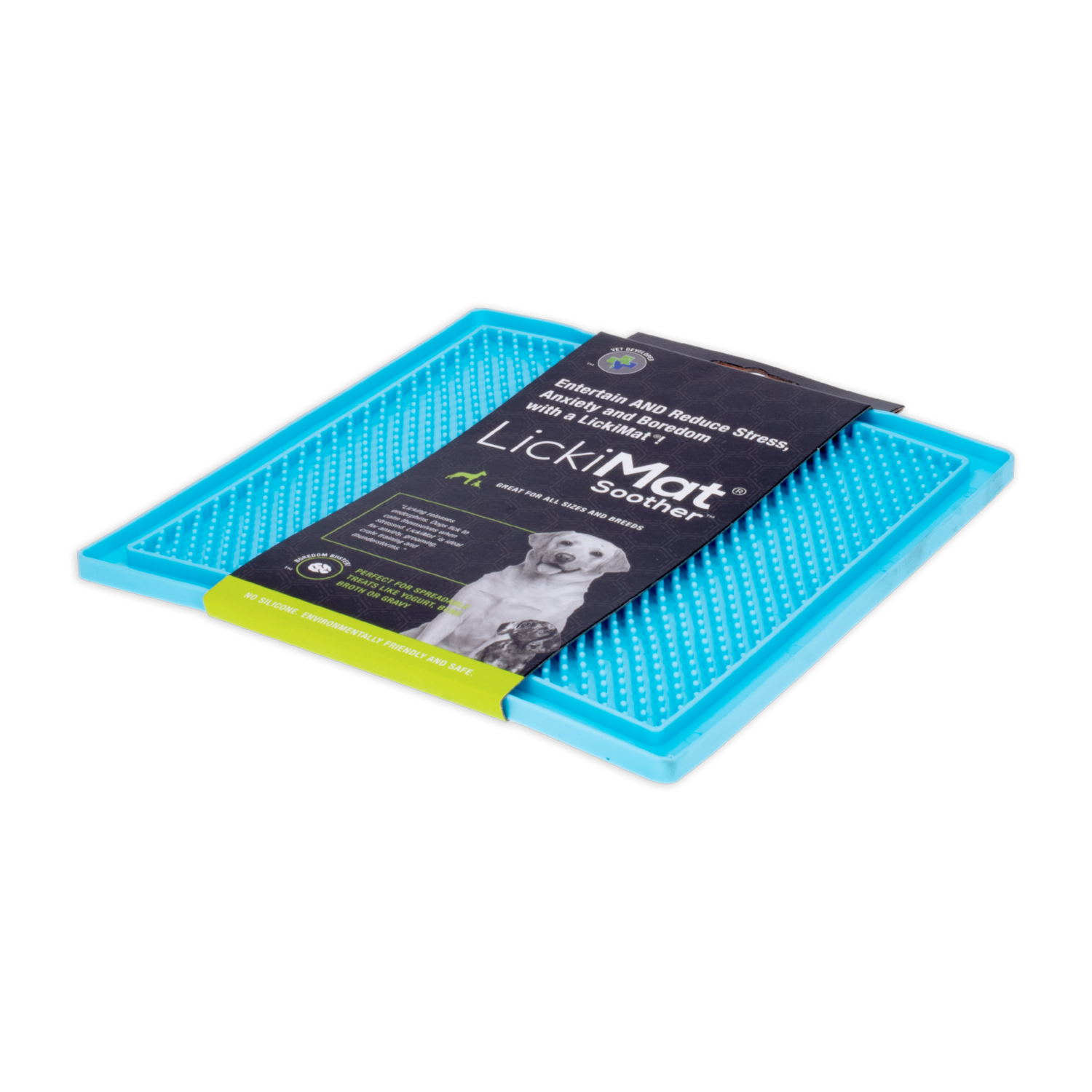 - LickiMat ayuda a calmar a su mascota mientras disfruta de su golosina favorita al ayudar a liberar endorfinas a través de la promoción del lamido
