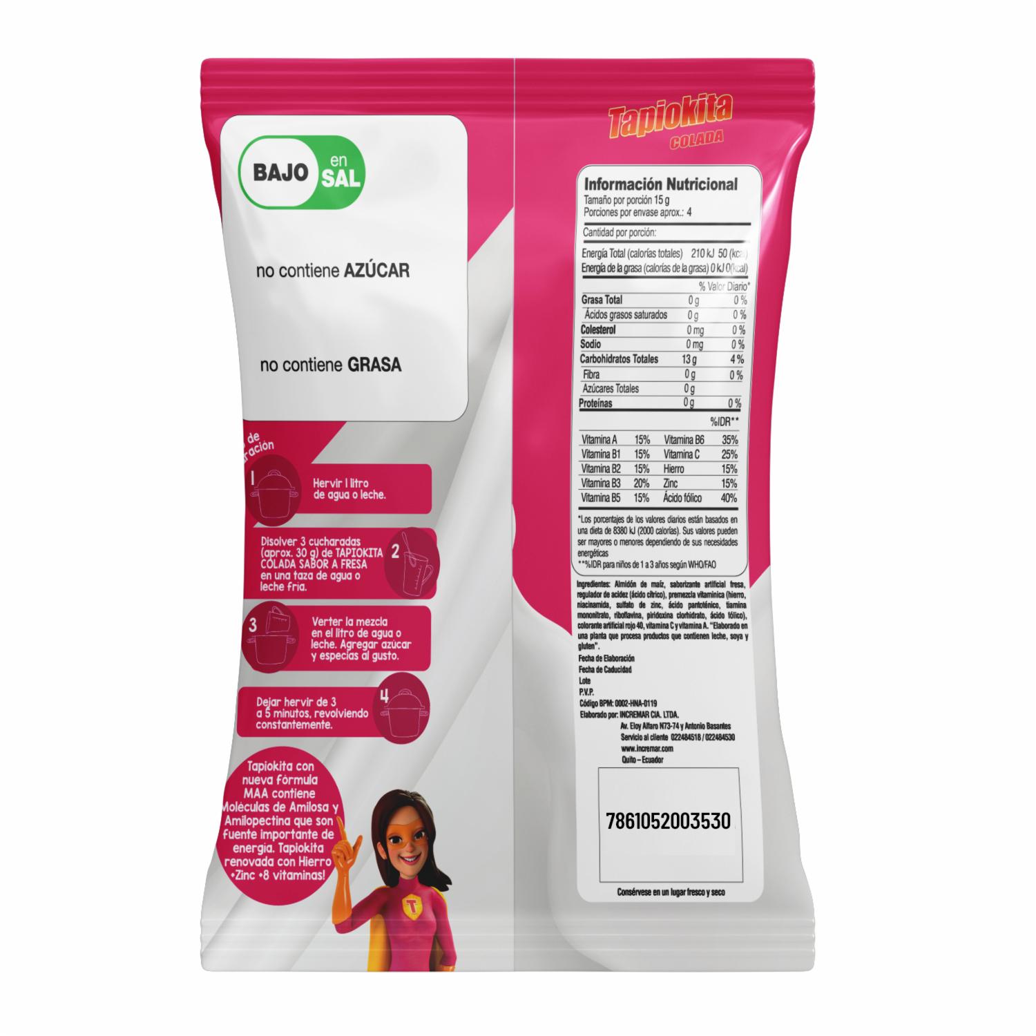 consultando preciosColada Sabor Fresa TAPIOKITA 60 G – TAPIOKITA. Disponible en nuestros locales. Precio y stock pueden variar según la tienda.
