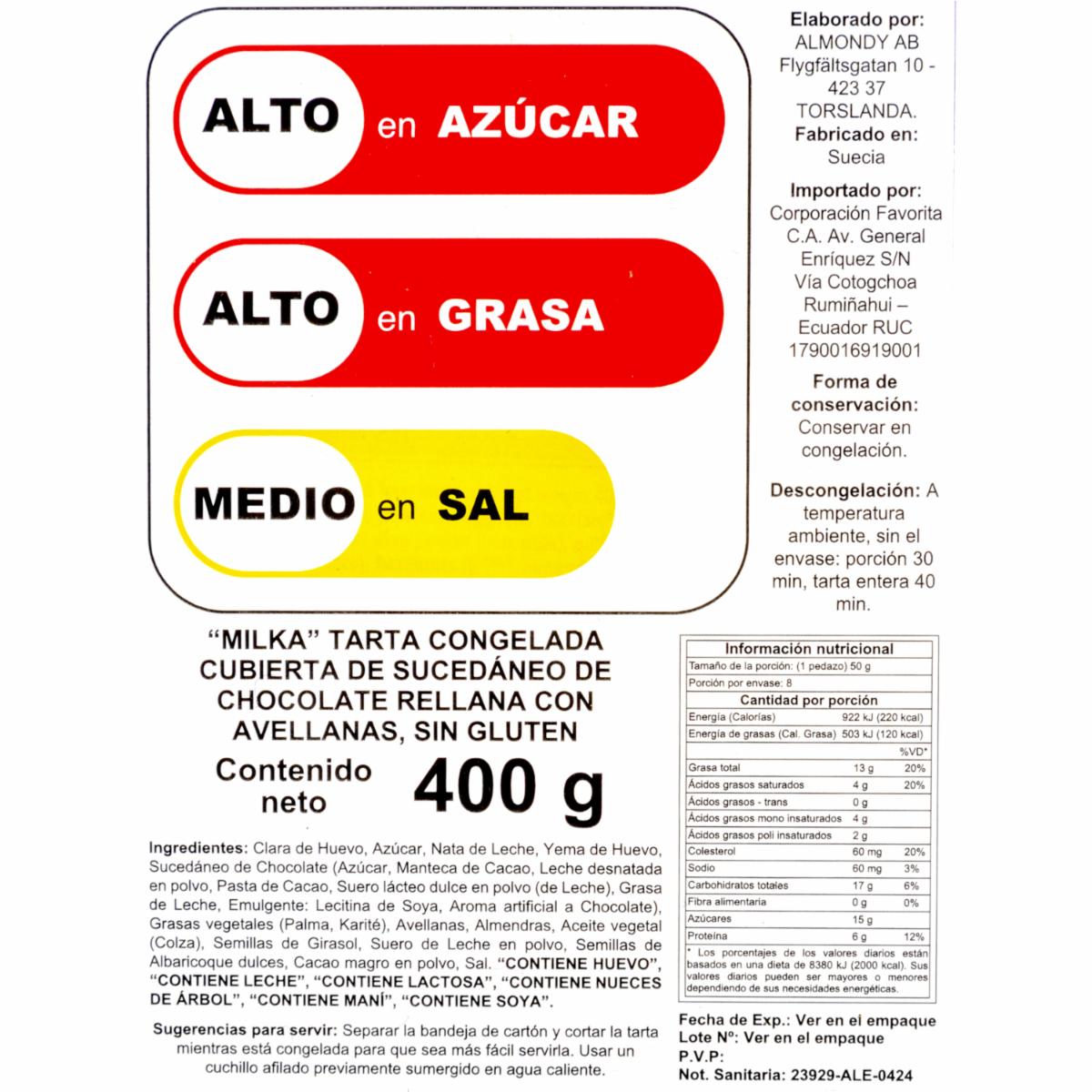 - Tarta Milka congelada cubierta de sucedáneo de chocolate rellana con avellanas, sin gluten