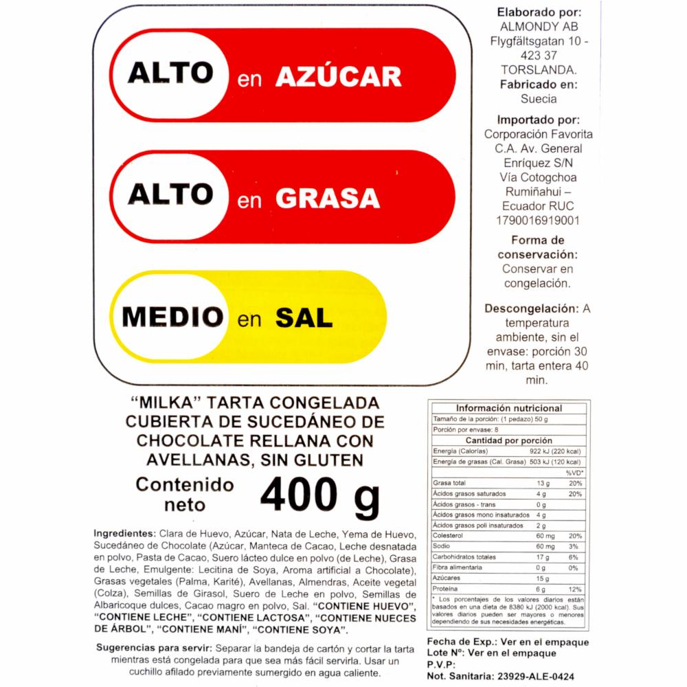 Tarta Milka congelada cubierta de sucedáneo de chocolate rellana con avellanas, sin gluten