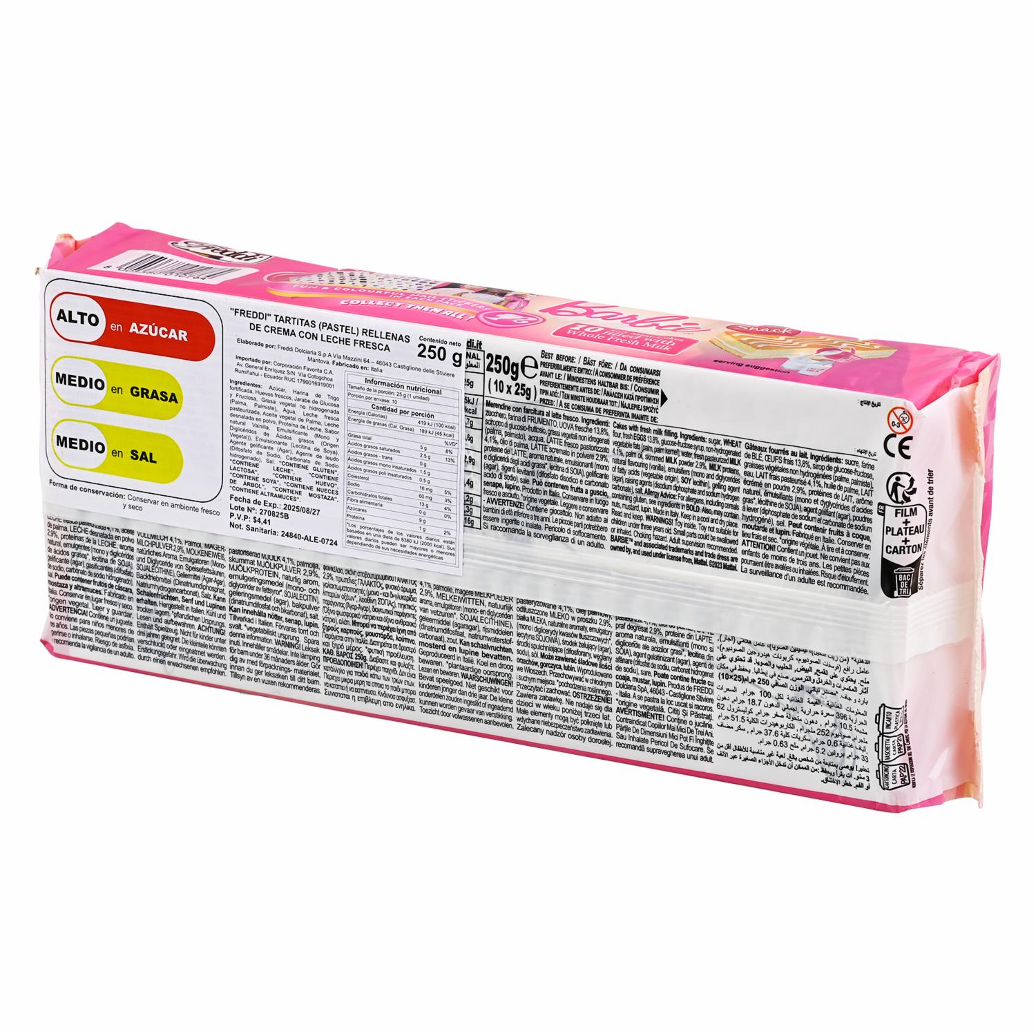 - Tartitas rellenas de crema con leche fresca, delicadamente elaboradas con una base crujiente y un relleno suave y cremoso. Su sabor suave y delicioso, combinado con la frescura de la leche, las convierte en el postre perfecto para cualquier ocasión. Ideales para disfrutar en meriendas, como snack o acompañadas de una bebida caliente