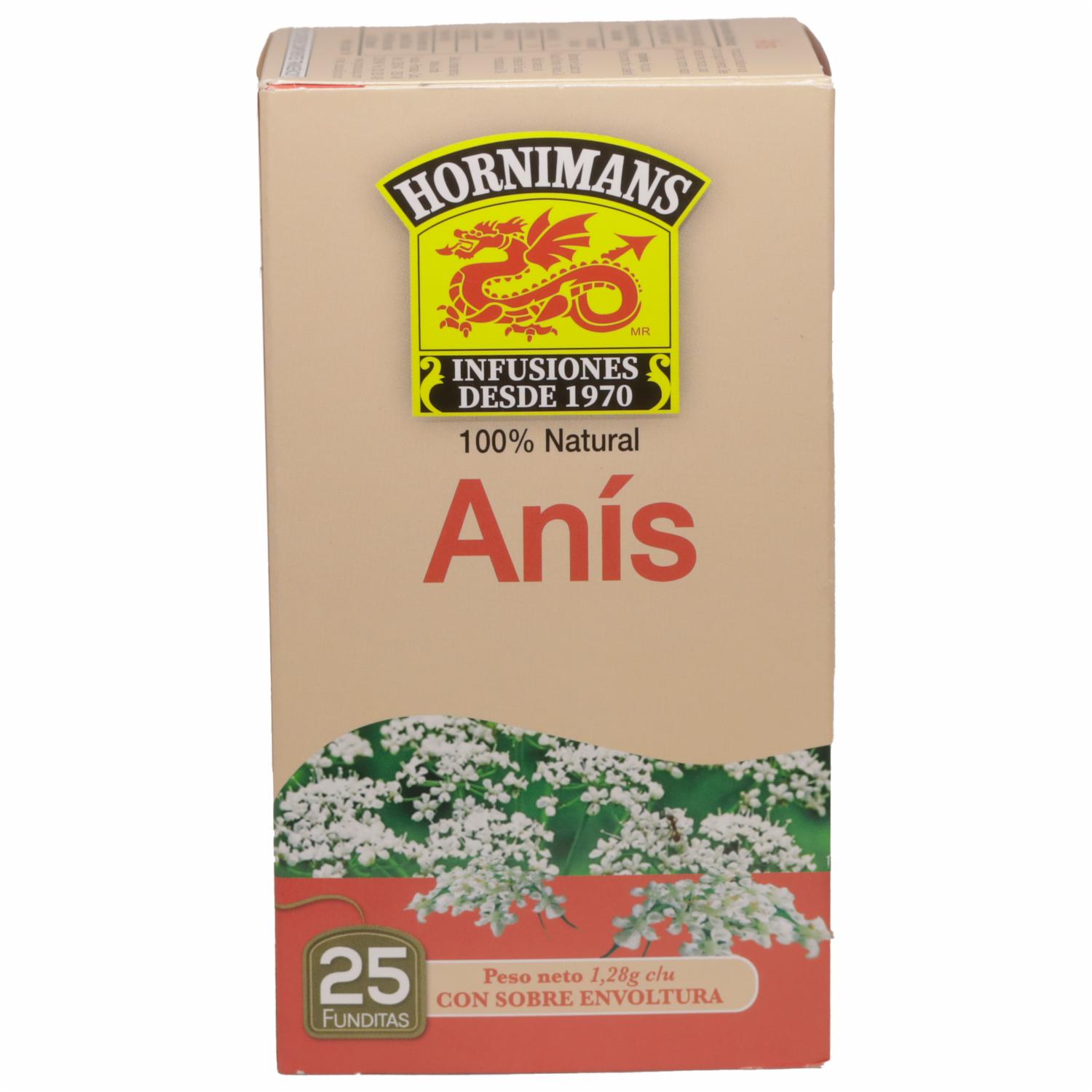 - La infusión de Anís Hornimans tiene como beneficios en el Sistema digestivo, nervioso y respiratorio. Gracias a sus propiedades carminativas antiespasmódicas y sedantes, alivia cólicos, flatulencias, problemas respiratorios y estrés, regula la menstruación y contribuye a la lactancia