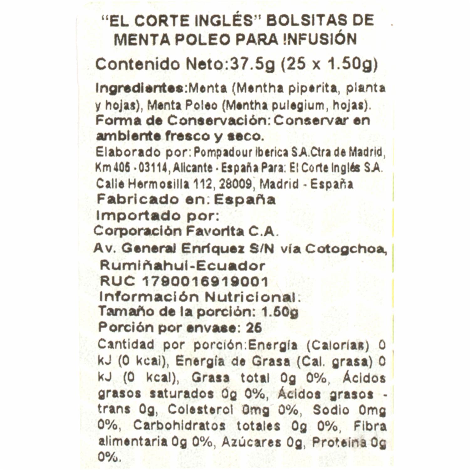 - La Infusión de Menta y Poleo El Corte Inglés es una mezcla refrescante y estimulante, ideal para disfrutar en cualquier momento del día. Con 37.50 g de hojas secas de menta y poleo, esta infusión combina el sabor fresco y revitalizante de la menta con el toque herbal y suave del poleo, una planta conocida por sus propiedades digestivas y calmantes