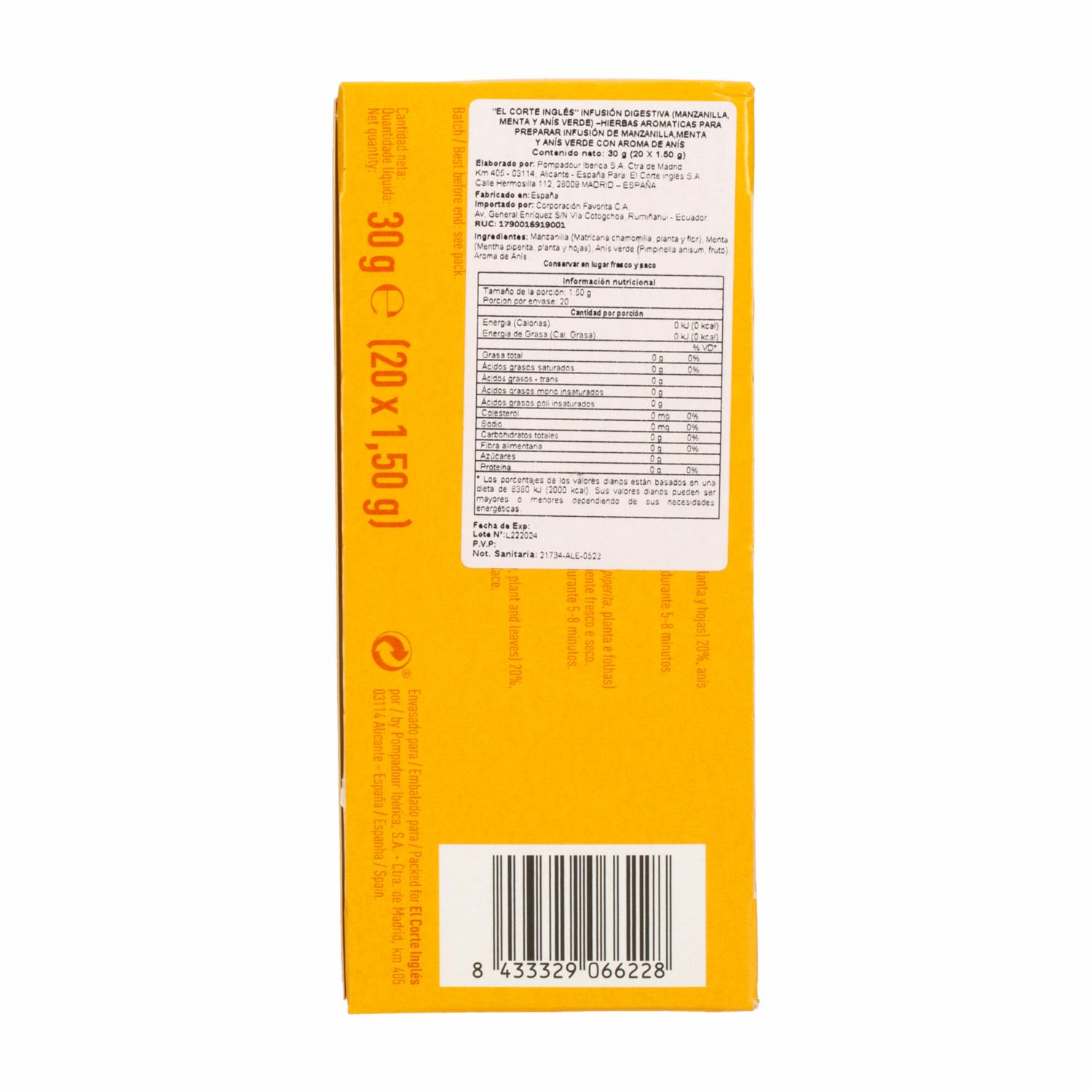 - La Infusión Digestiva de Anís y Manzanilla El Corte Inglés es una combinación de hierbas naturales diseñada para promover la digestión y aliviar malestares estomacales. Con 30 g de mezcla de anís y manzanilla de alta calidad, esta infusión tiene un sabor suave, ligeramente dulce y herbal, ideal para disfrutar después de las comidas