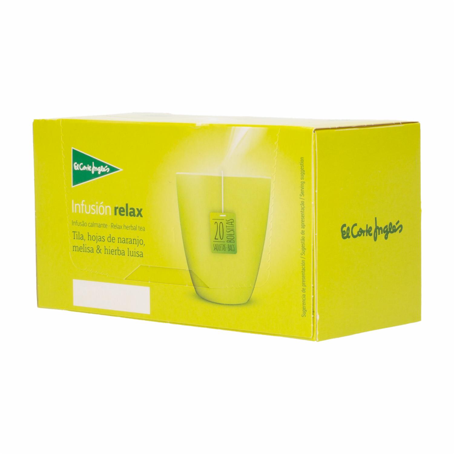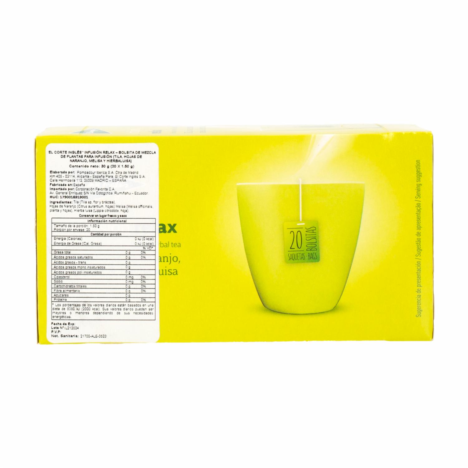 - La Infusión Relax de Tila, Melisa y Hierbaluisa El Corte Inglés es una combinación perfecta de hierbas naturales diseñada para proporcionar una sensación de calma y bienestar. Con 30 g de mezcla de tila, melisa (toronjil) y hierbaluisa, esta infusión tiene propiedades relajantes y tranquilizantes, ideal para aliviar el estrés, reducir la ansiedad y promover un descanso reparador