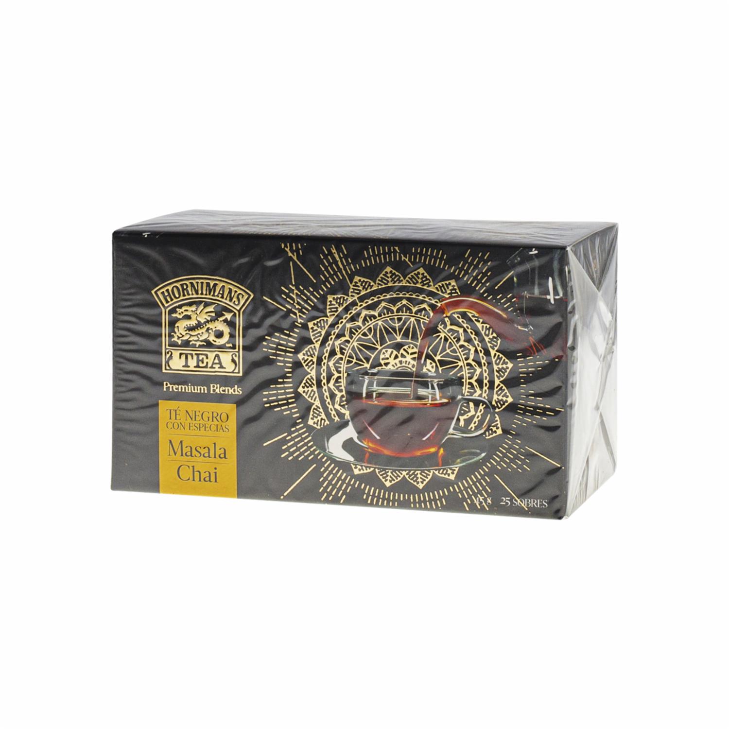 - El Té Negro Masala Chai de Hornimans es una exquisita mezcla que combina el robusto sabor del té negro con una cuidadosa selección de especias aromáticas. Cada sorbo te transporta a un viaje de sabores intensos y reconfortantes, con notas cálidas de canela, cardamomo, clavo de olor, jengibre y pimienta negra