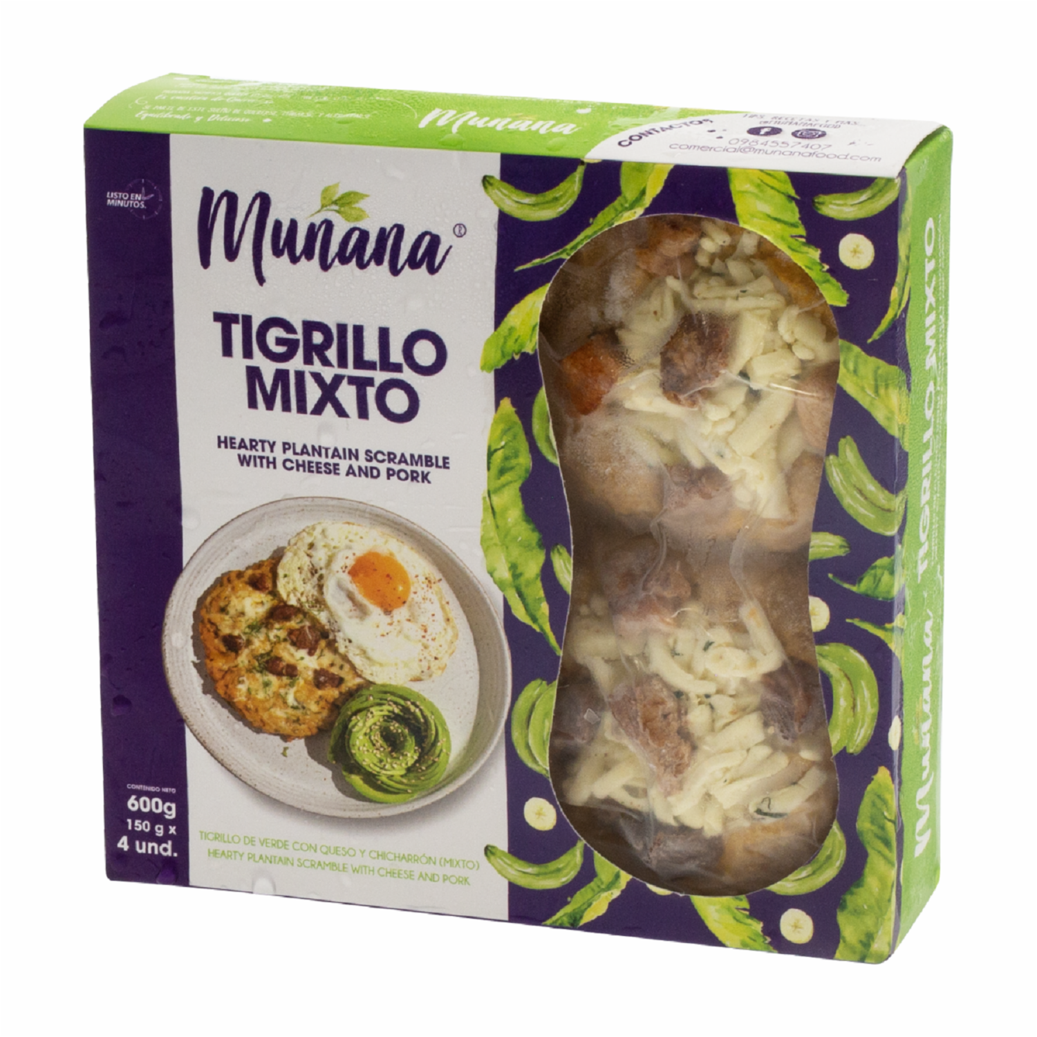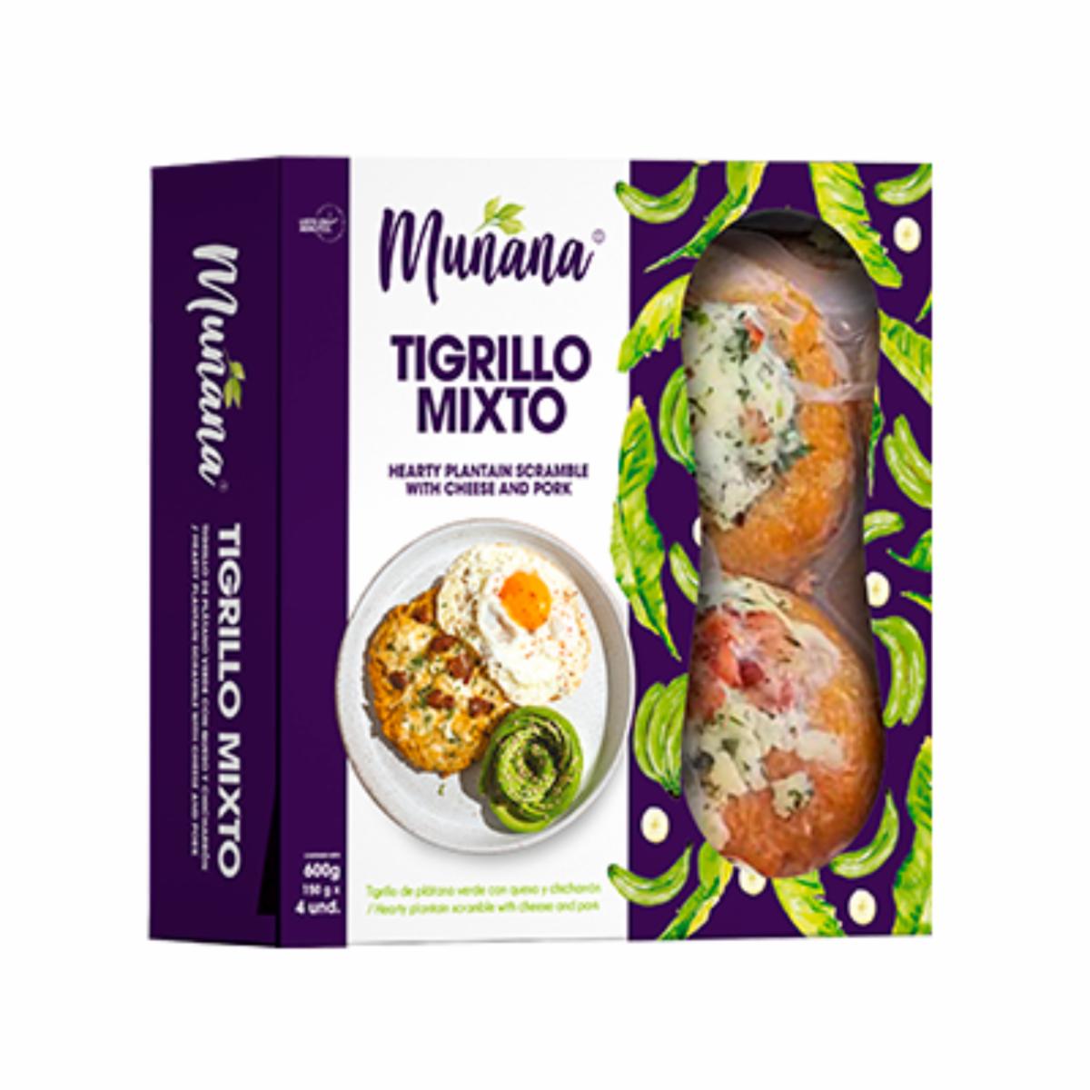 - Disfruta de este clásico de la comida costeña ecuatoriana en tan solo minutos, solo calienta y sirve y al instante te deleitarás de este Tigrillo de Plátano Verde mixto con queso y chicharrón de MUNANA 4 uds x 150 g. de MUNANA FOOD busca devolver el tiempo de calidad y bienestar a las familias con alimentos congelados, listos en minutos, equilibrados & deliciosos