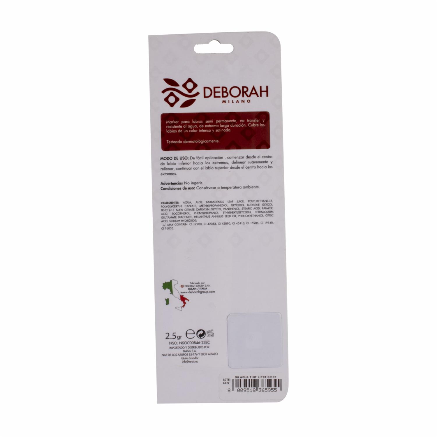 - La tinta para labios Aqua Coral Red 07 de Deborah es un producto de maquillaje líquido que proporciona un color intenso y duradero en los labios