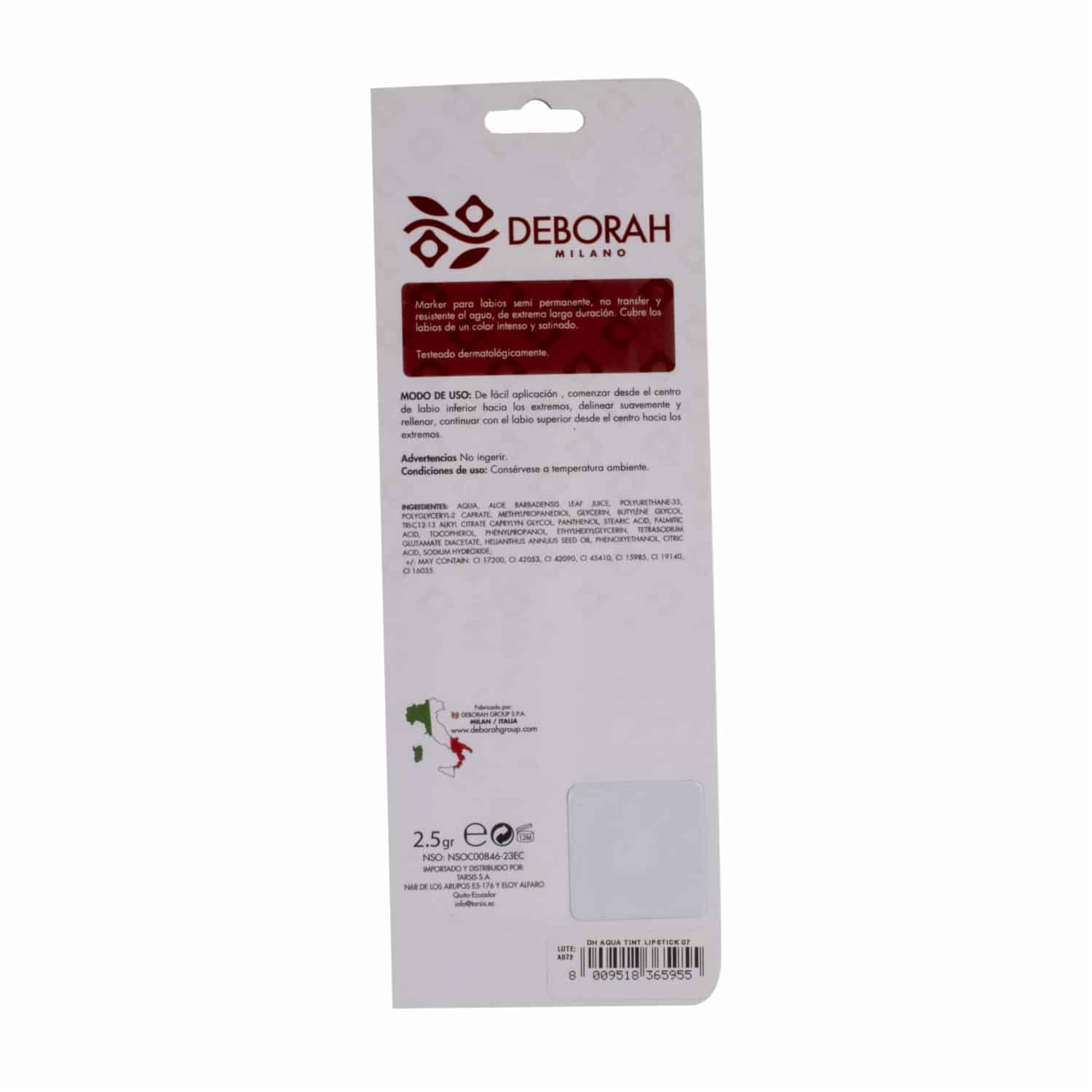 • La tinta para labios Aqua Coral Red 07 de Deborah es un producto de maquillaje líquido que proporciona un color intenso y duradero en los labios