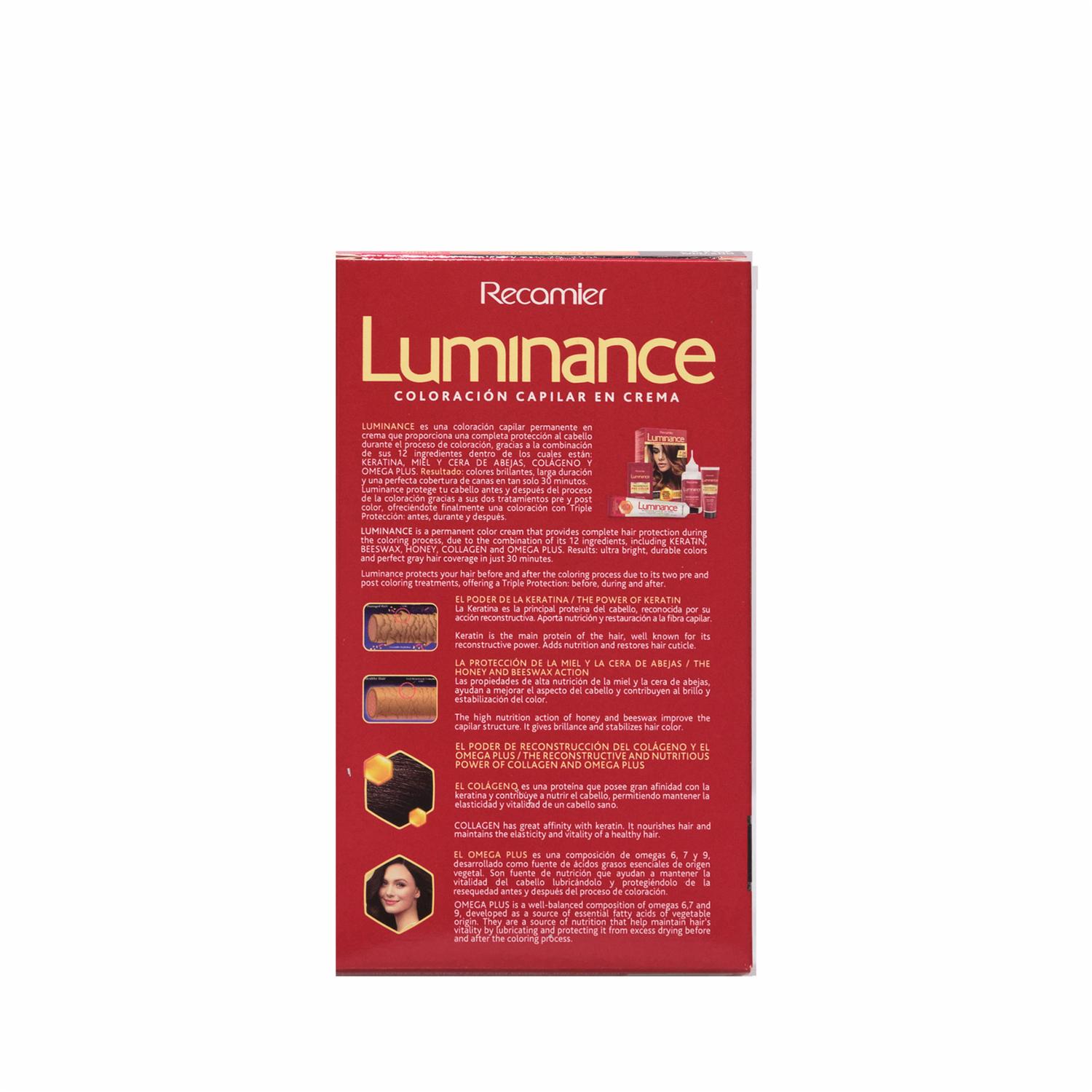 Luminance cuenta con el Sistema 3 Plus, que te acompañará en el proceso de coloración con triple protección gracias a sus dos tratamientos, pre-color y post-color. Su fórmula, con escudo protector, contiene ingredientes de origen natural como: la cera y la miel de abejas, la keratina, el colágeno y el omega plus. PRODUCTOS