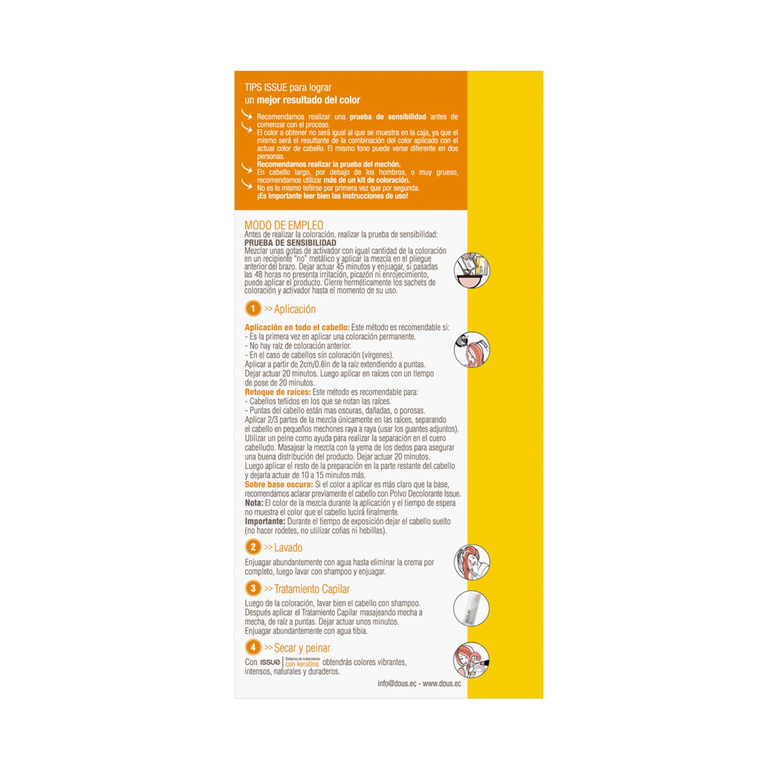 Concepto innovador en coloración, aporta al cabello un color más duradero y brillante. Posee una exclusiva formulación de alta calidad, con Vitamina C que permite preservar los colorantes de una oxidación prematura. Integra todos los componentes necesarios para la aplicación del color que permiten lograr un resultado efectivo y duradero. Contiene: 1 Coloración en Crema (sachet). 1 Activador en crema (peróxido). 1 Juego de Guantes. 1 Sachet de Máscara con Keratina o Tratamiento Pre y Post Color