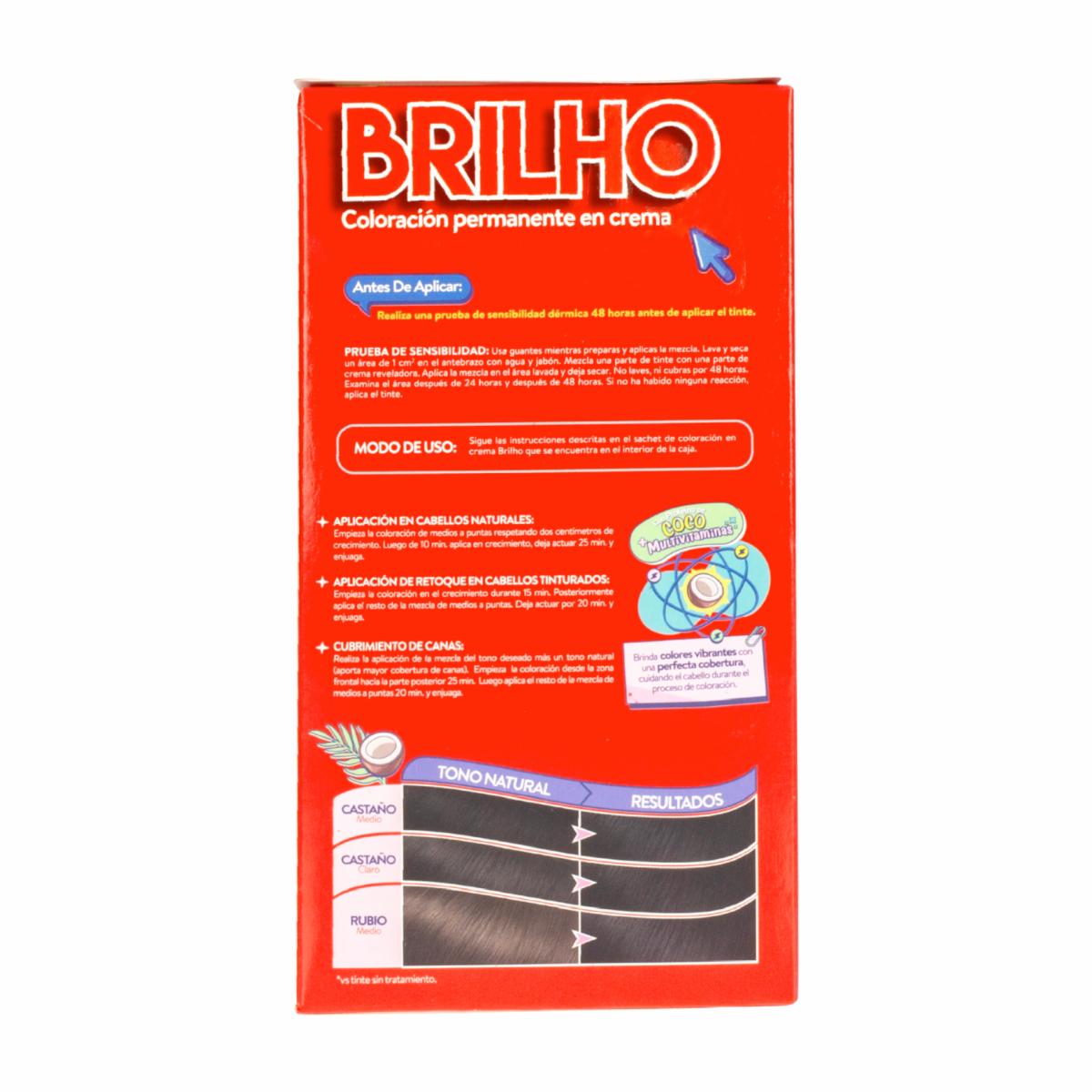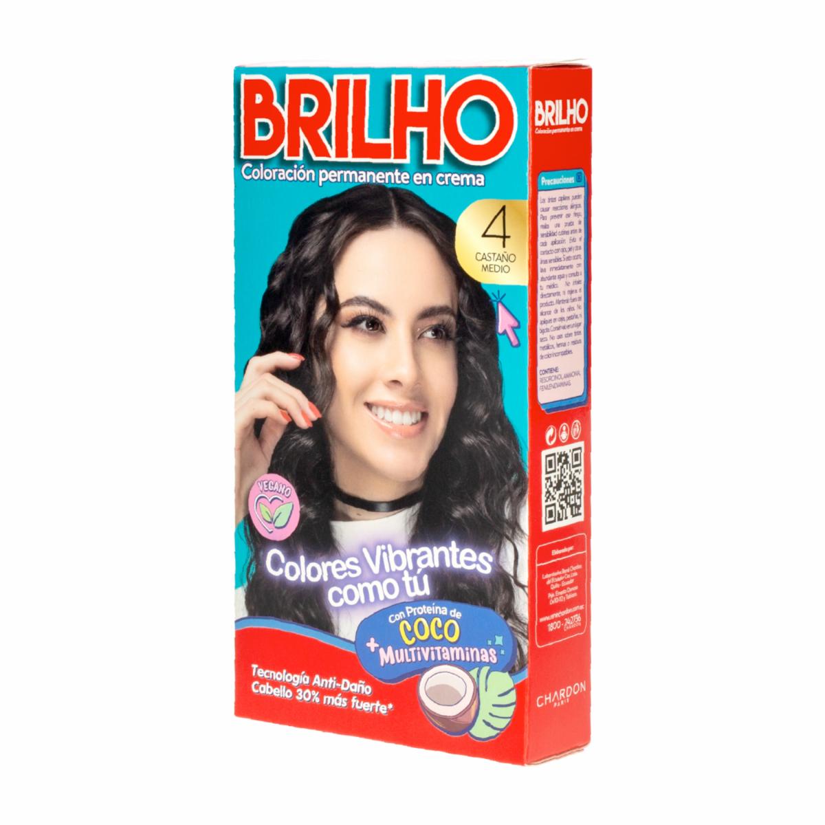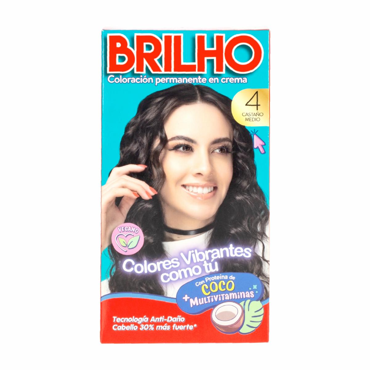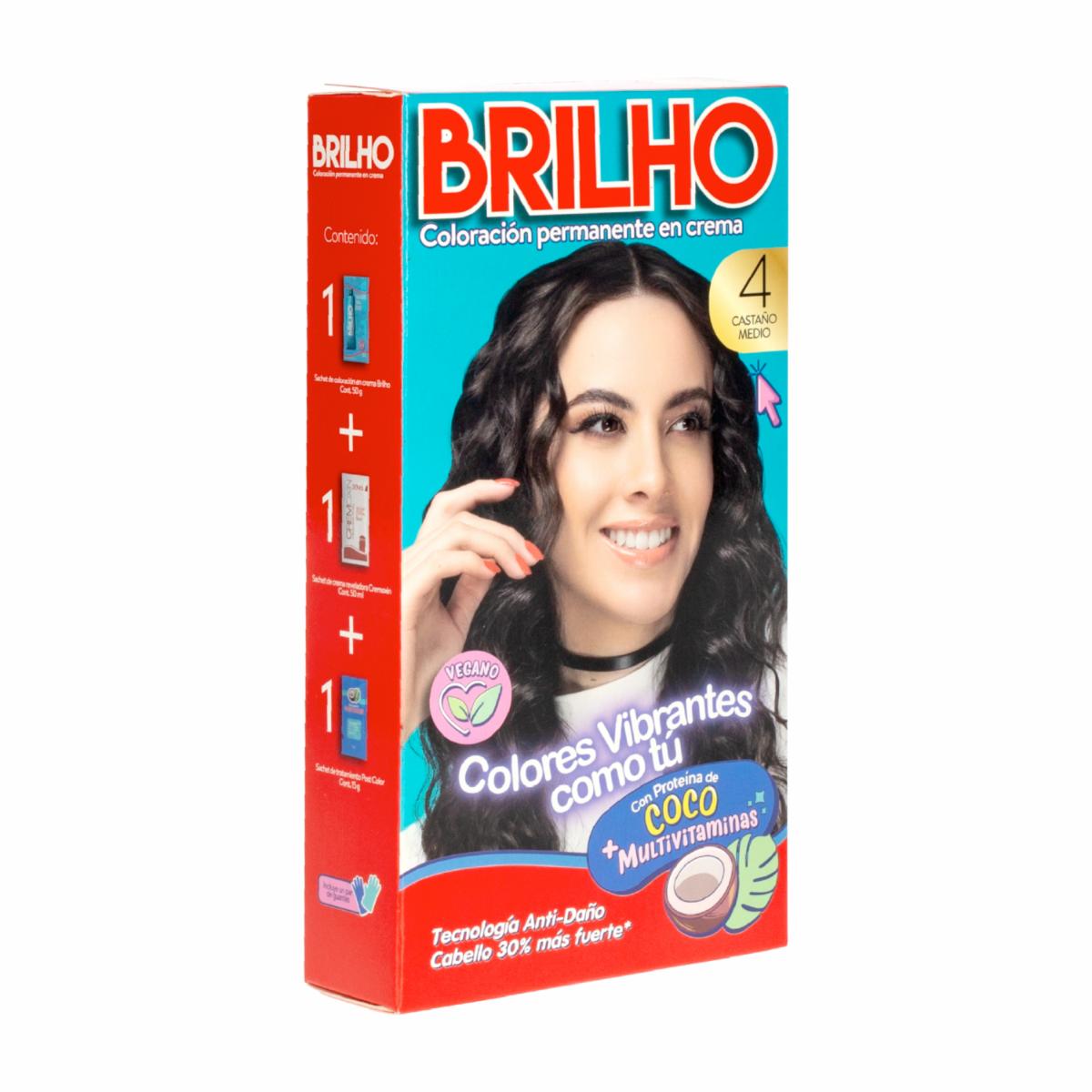 • El Tinte de Cabello Permanente en Crema Tono 4 Castaño Medio BRILHO de 50 g contiene proteína de coco y un complejo multivitamínico con tecnología anti-daño, que fortalece el cabello hasta un 30% más