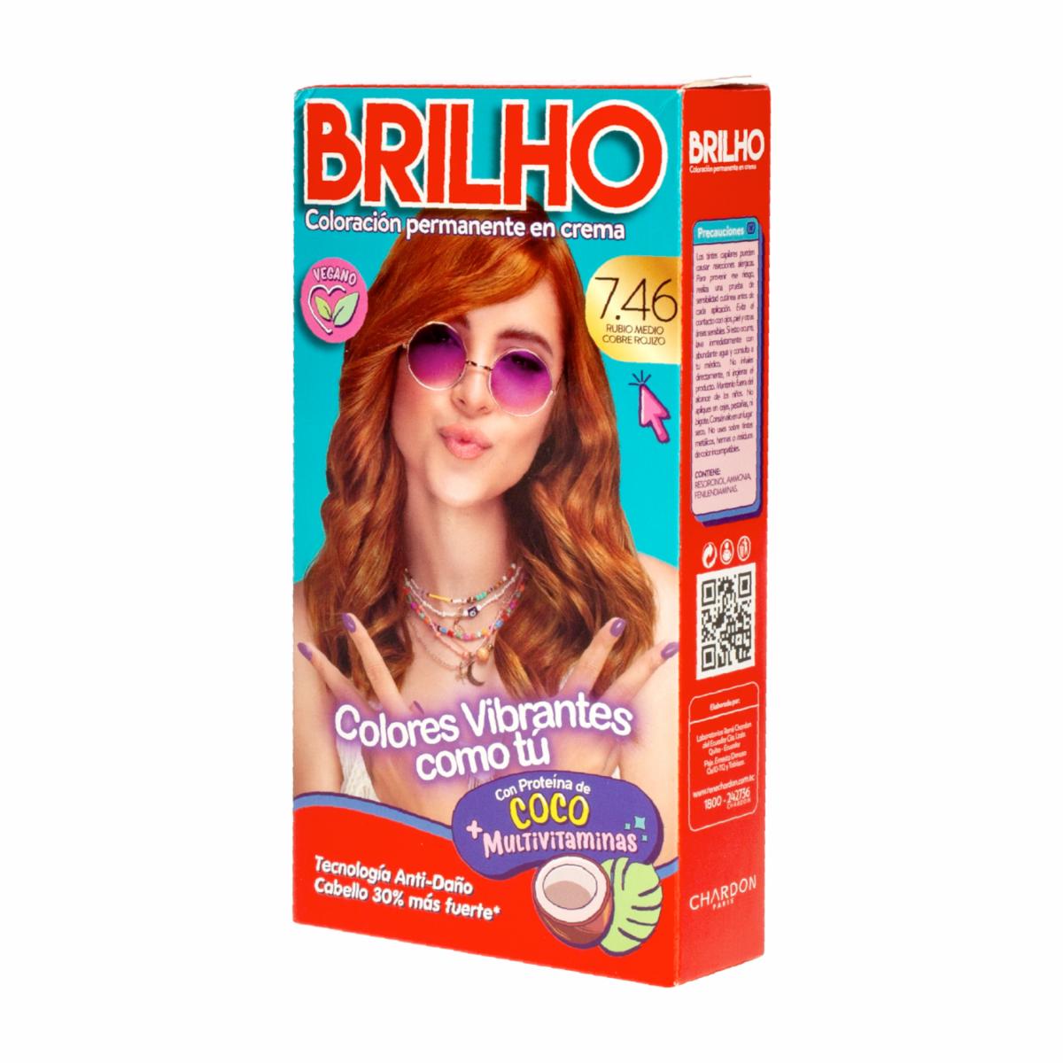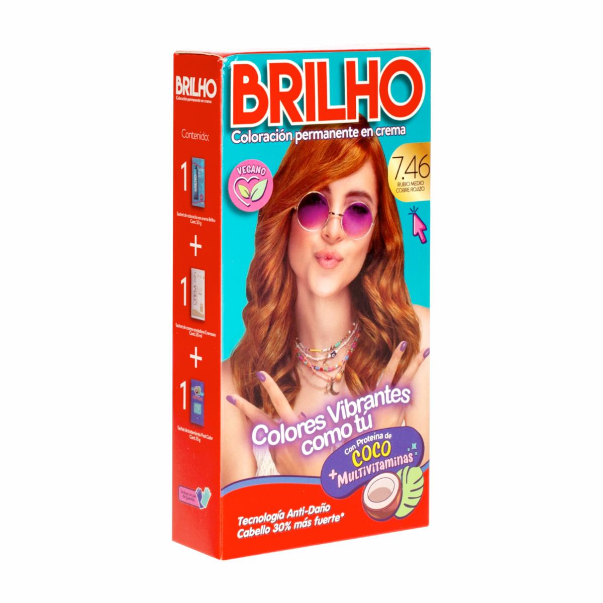 • El Tinte de Cabello Permanente en Crema Tono 7.42 Rubio Medio Cobre Rojizo BRILHO de 50 g contiene proteína de coco y un complejo multivitamínico con tecnología anti-daño, que fortalece el cabello hasta un 30% más