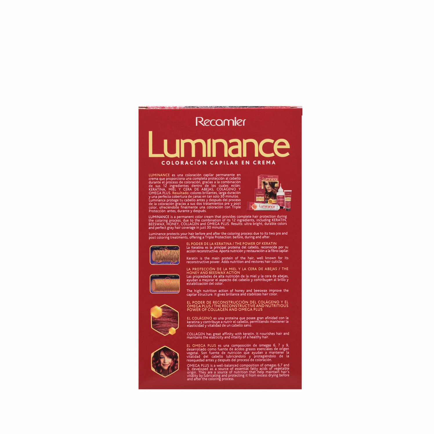 - Luminance cuenta con el Sistema 3 Plus, que te acompañará en el proceso de coloración con triple protección gracias a sus dos tratamientos, pre-color y post-color. Su fórmula, con escudo protector, contiene ingredientes de origen natural como: la cera y la miel de abejas, la keratina, el colágeno y el omega plus.