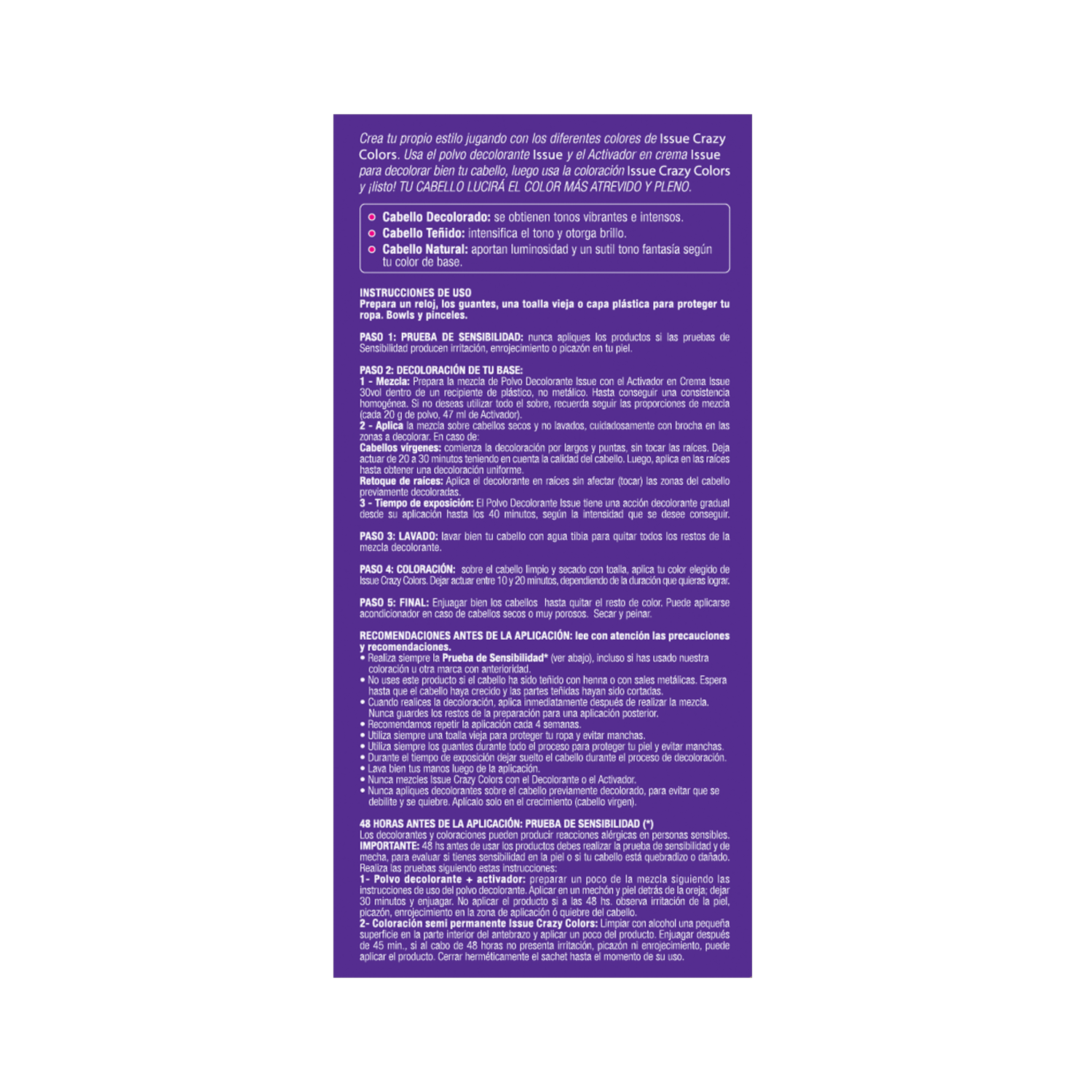 - Coloración directa con pigmentos de tonos puros y vibrantes que dan luminosidad y otorgan coloración semipermanente de una manera intensa. Su fórmula en crema no contiene amoníaco ni oxidantes y permite una coloración homogénea. Con su nueva tecnología anti-lavado los Crazy Colors tienen una duración de aprox. de 10 a 15 lavados (en cabellos muy porosos y decolorados, la duración puede ser mayor). Creá tu propio estilo jugando con los diferentes colores de Issue Crazy Colors