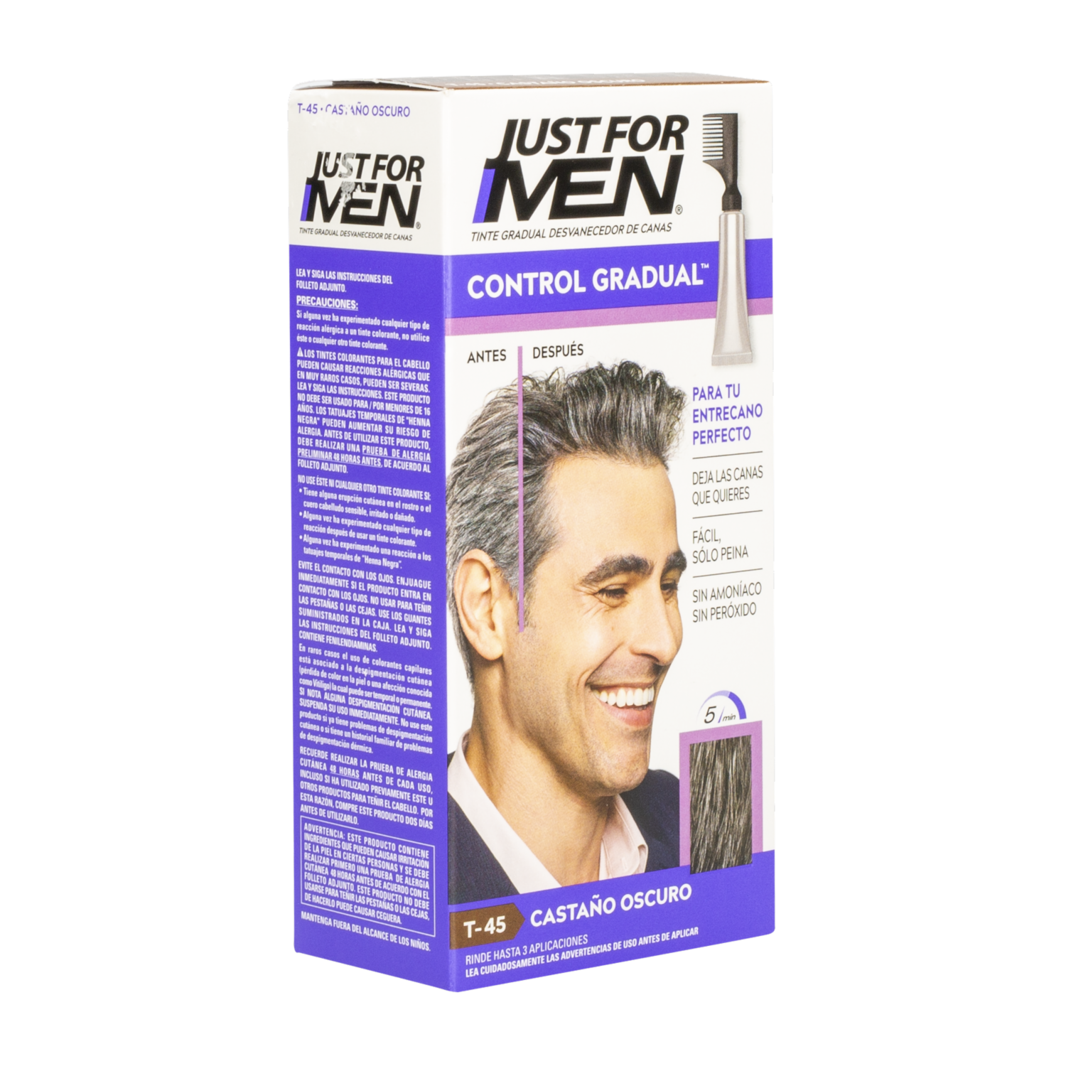 - El tinte para cabello Control Gradual N° T-45 Castaño Oscuro de JUST FOR MEN está diseñado para ofrecer una coloración gradual y controlada del cabello