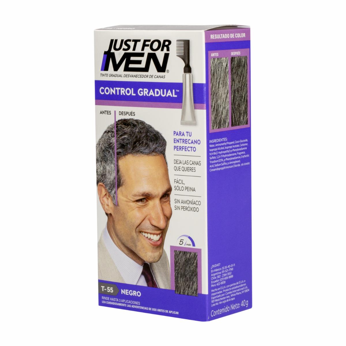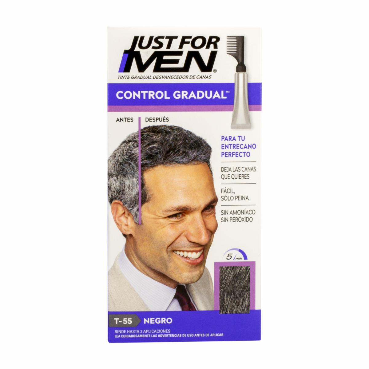 • El tinte para cabello Control Gradual N° T-55 Negro de JUST FOR MEN está diseñado para ofrecer una coloración gradual y controlada del cabello