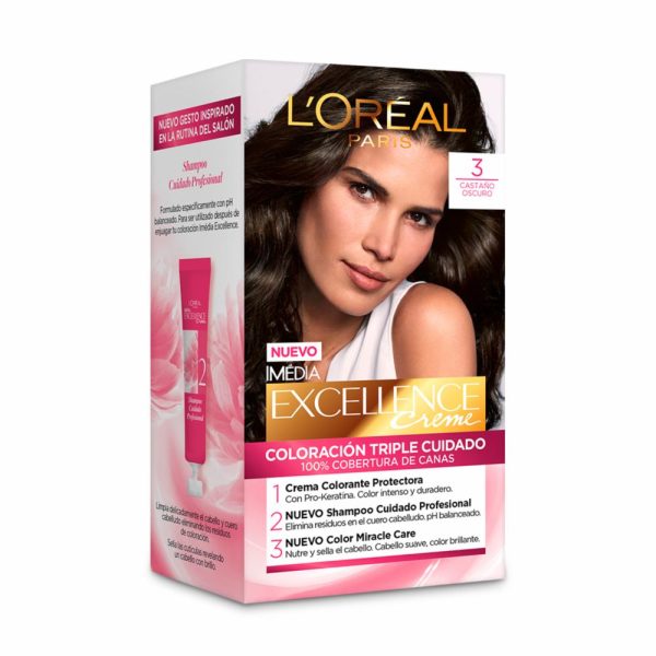 Para ti que te gusta lucir un tono de cabello más natural, nada como el Tinte para cabello Imédia Excellence de LOréal Paris. -Consigue una coloración de triple cuidado que tu cabello necesita. -Inspirada en una rutina de salón de belleza