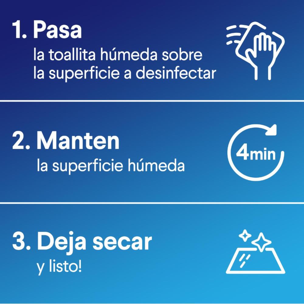 • Los organismos dañinos que suelen estar en múltiples superficies de tu hogar y en objetos de uso cotidiano, podrán ser desinfectados en un solo paso, gracias a los ingredientes activos de las toallitas. Además, brindan 48 horas de prevención contra las bacterias