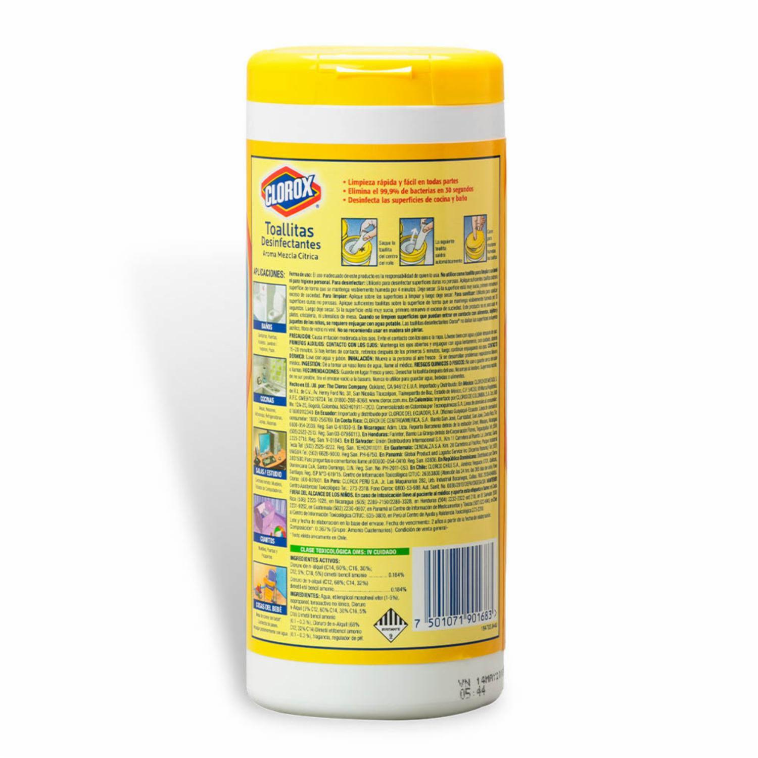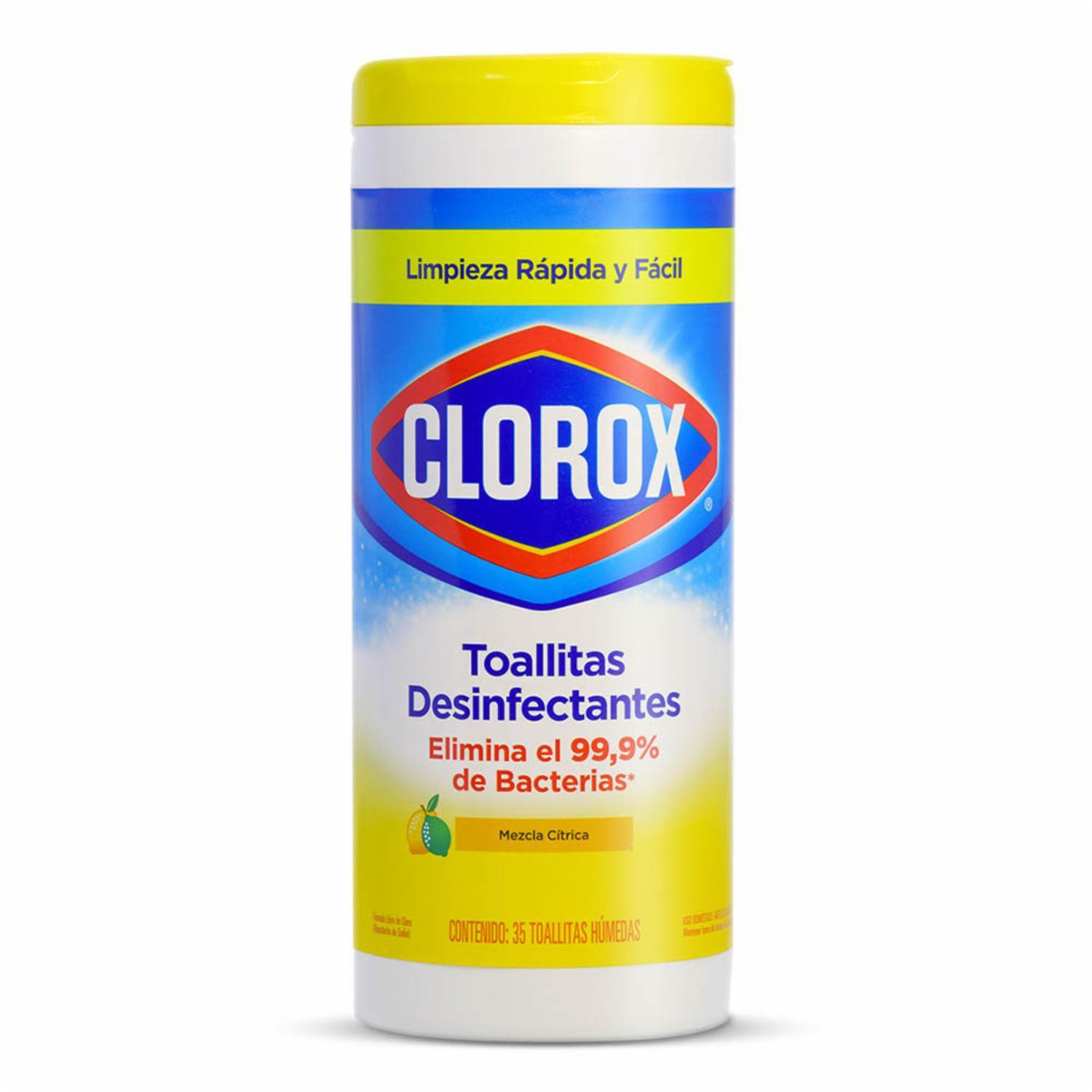 - Usar las Toallitas Desinfectantes Clorox Mezcla Cítrica es una forma fácil y rápida de limpiar y desinfectar múltiples superficies, ya que, en tan solo un minuto, eliminan el 99.9% virus y bacterias, incluyendo el virus causante del COVID-19. Los organismos dañinos que suelen estar en múltiples superficies de tu hogar y en objetos de uso cotidiano, podrán ser desinfectados en un solo paso, gracias a los ingredientes activos de las toallitas que no contienen cloro