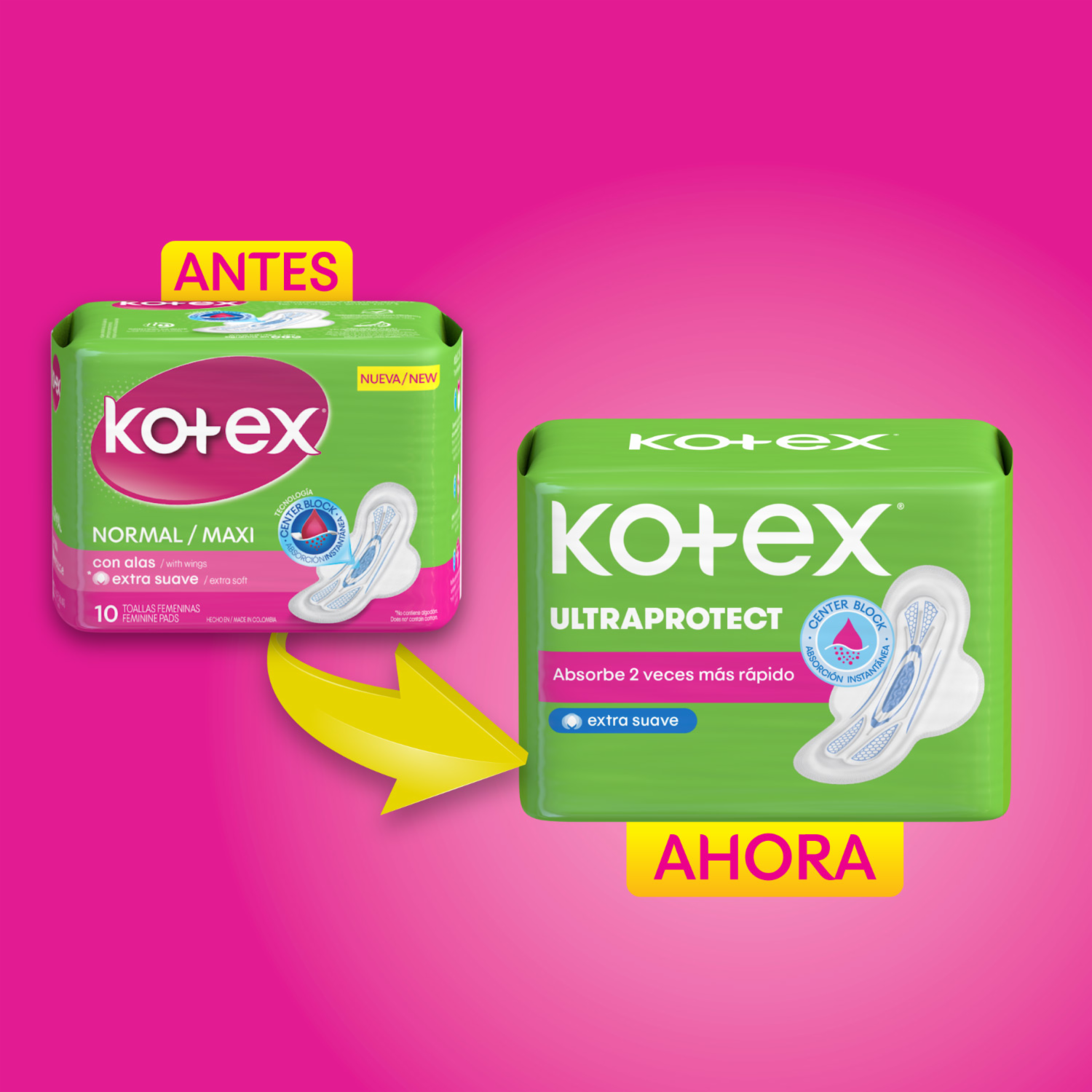 - Kotex® Normal. Absorbe instantáneamente el flujo y controla el olor, encapsulándolo con su tecnología NeutraOdor, para mayor frescura. Cuenta con cubierta extra suave, para máxima comodidad al contacto con tu piel; así como también, con un diseño anatómico para prevenir el movimiento y los desbordes