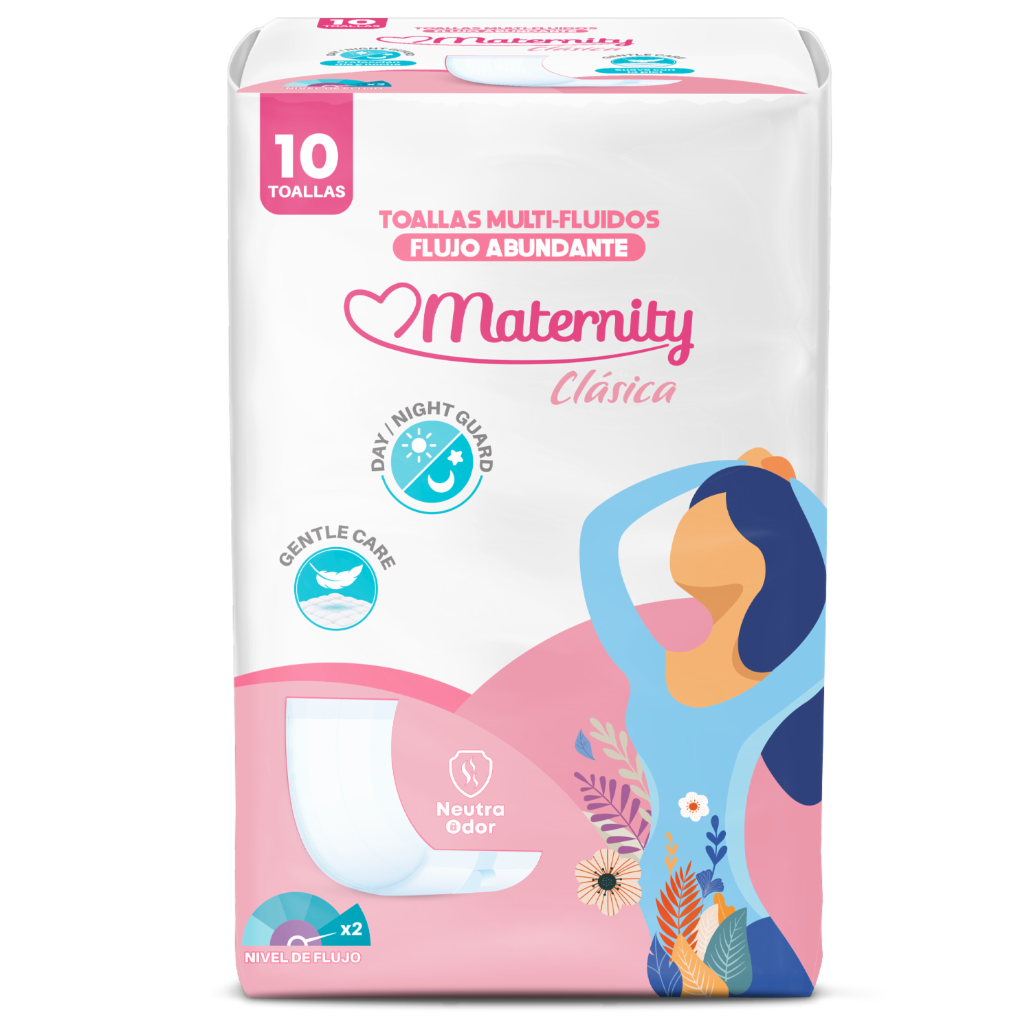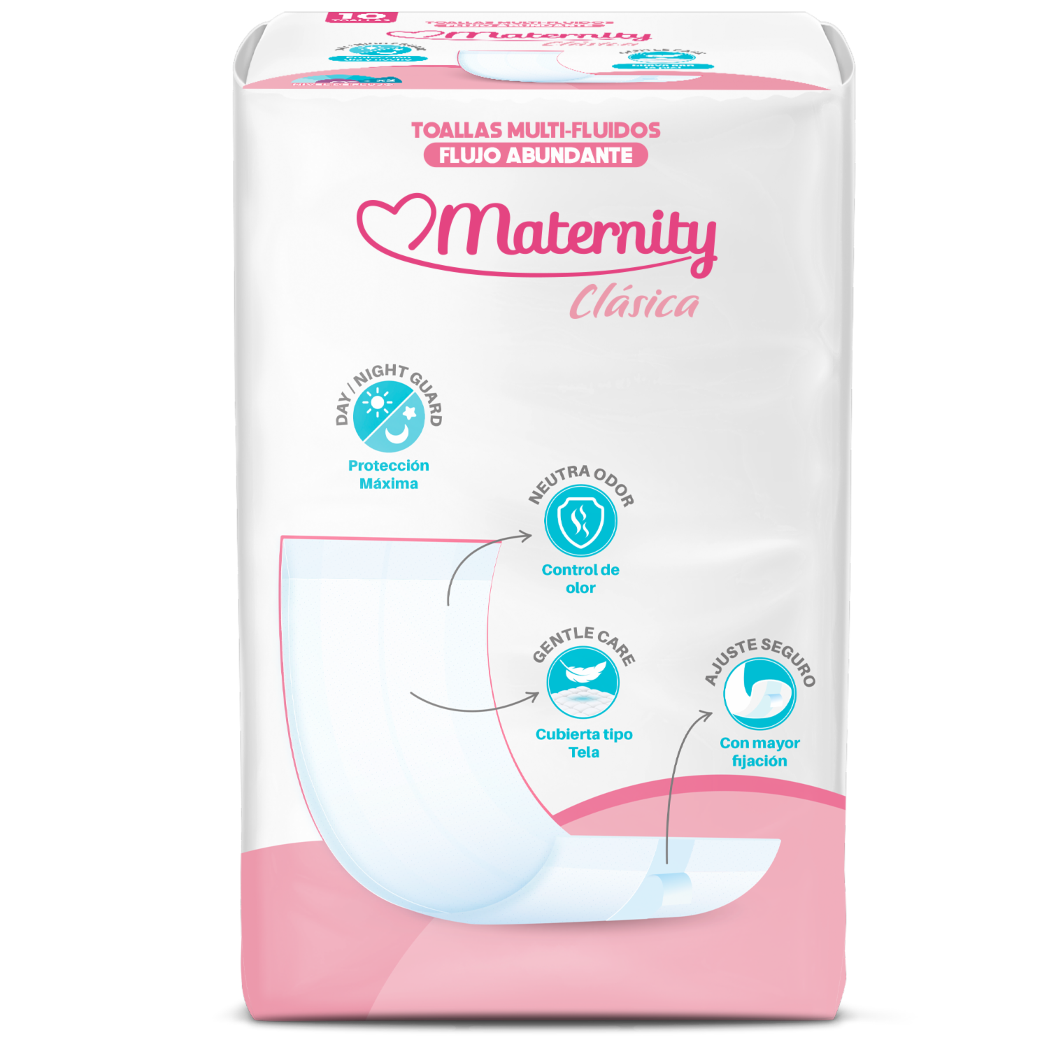 - La Toalla Multifluidos Maternity Clásica ofrece absorción ideal y protección total de día y de noche. Su diseño garantiza protección integral contra diversos fluidos, mientras que el nuevo neutralizador de olores garantiza discreción absoluta. Con tela suave y cinta adhesiva que brindan comodidad y sujeción firme, ideal para mujeres en el postparto y con flujo abundante