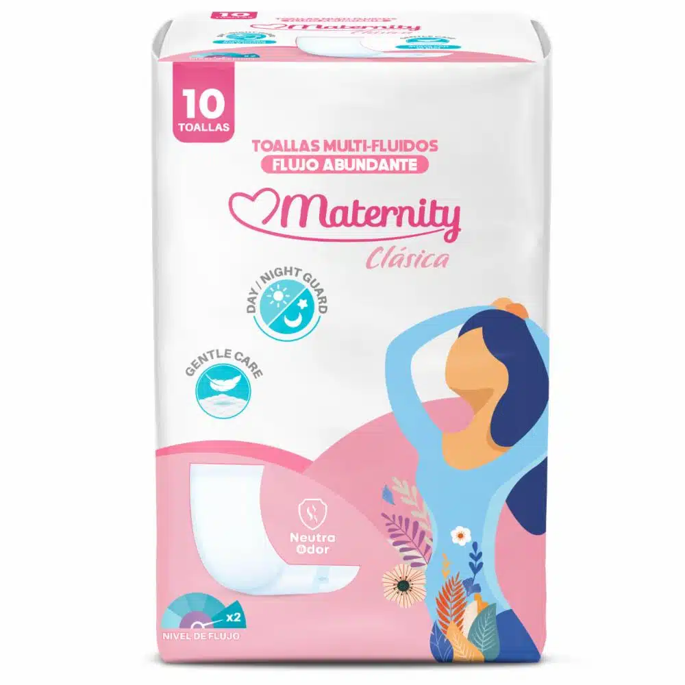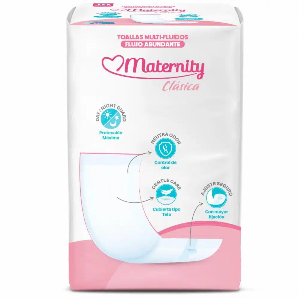 La Toalla Multifluidos Maternity Clásica ofrece absorción ideal y protección total de día y de noche. Su diseño garantiza protección integral contra diversos fluidos, mientras que el nuevo neutralizador de olores garantiza discreción absoluta. Con tela suave y cinta adhesiva que brindan comodidad y sujeción firme, ideal para mujeres en el postparto y con flujo abundante