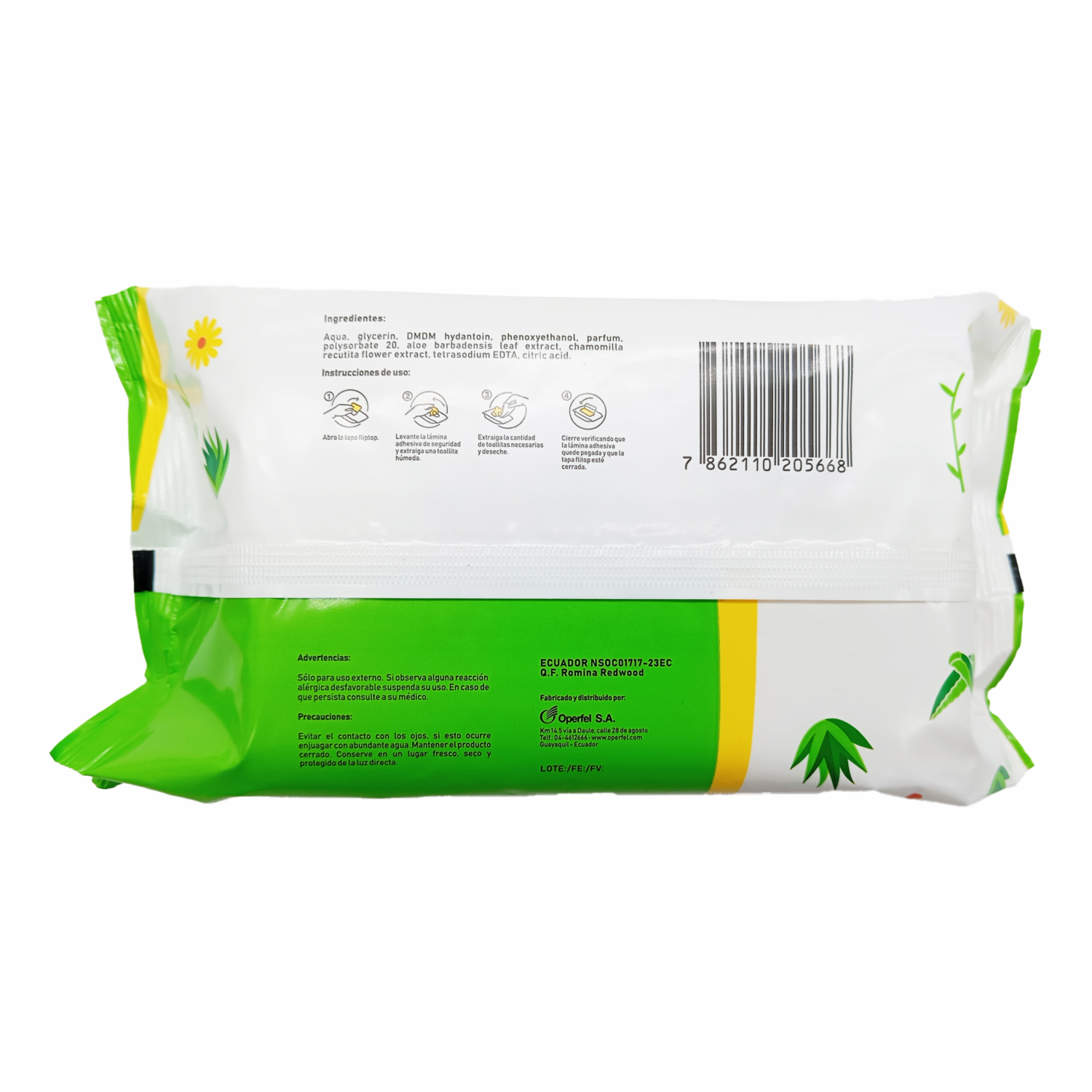 - Con extracto natural de Aloe vera y manzanilla, son ideales para el cuidado diario para la piel del bebé y de la familia. Tienen una delicada fragancia, sin alcohol y parabenos, fibras suaves. Precauciones: evitar el contacto con los ojos, si esto ocurre enjuagar con abundante agua. Mantener el producto cerrado