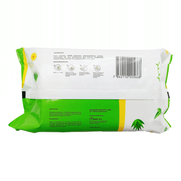 Con extracto natural de Aloe vera y manzanilla, son ideales para el cuidado diario para la piel del bebé y de la familia. Tienen una delicada fragancia, sin alcohol y parabenos, fibras suaves. Precauciones: evitar el contacto con los ojos, si esto ocurre enjuagar con abundante agua. Mantener el producto cerrado