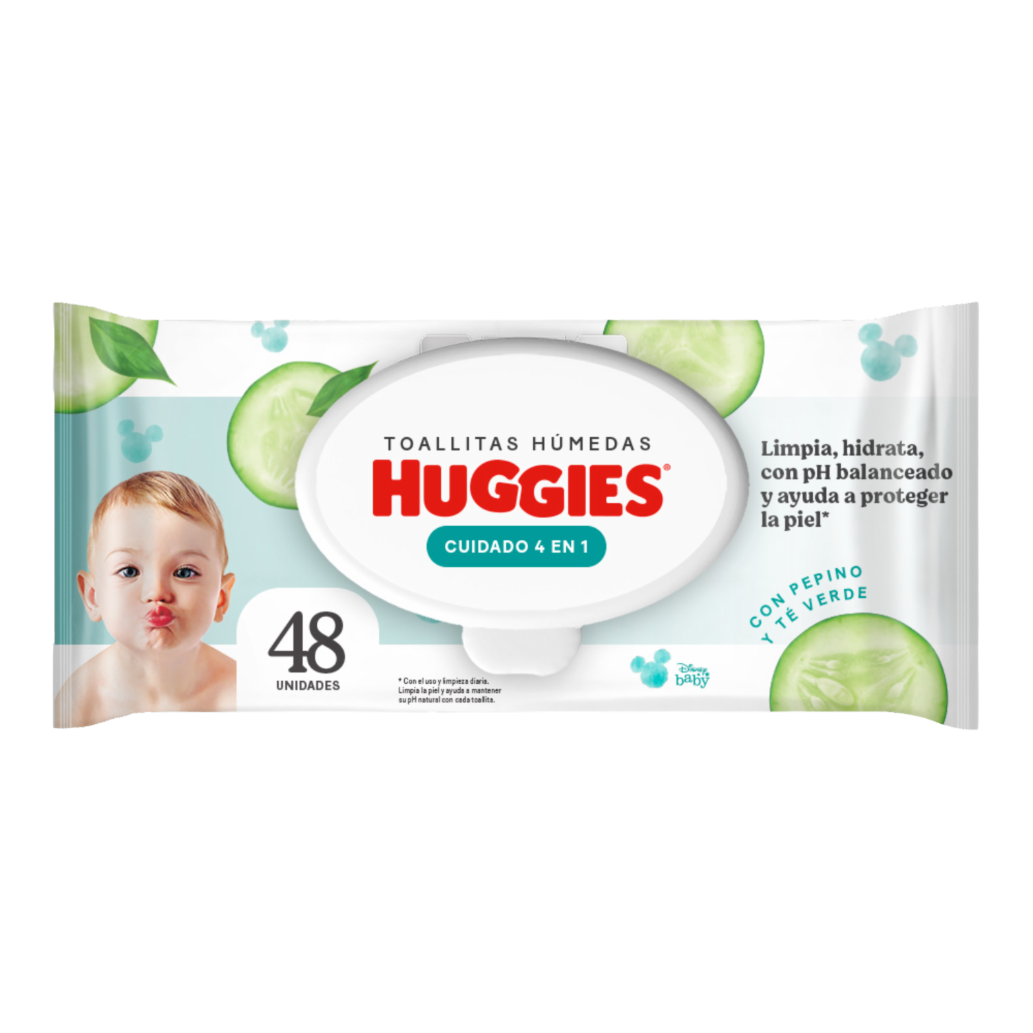 - Toallitas Húmedas Huggies® Cuidado 4 en 1. Cuidado natural con Eco-Fibras de origen natural contenidas en el producto para una suavidad como el algodón?. Con estracto de Pepino y Té verde.?,pH balanceado ayuda a prevenir irritación e hidratar?. Máxima limpieza desde la primera pasada?. Hipoalergénicas, sin parabenos ni alcohol..?. Aprovecha tus toallitas húmedas para otros usos:? Antes y después de comer. Después de jugar con animales o en la calle?. Al estornudar, o al salir del baño