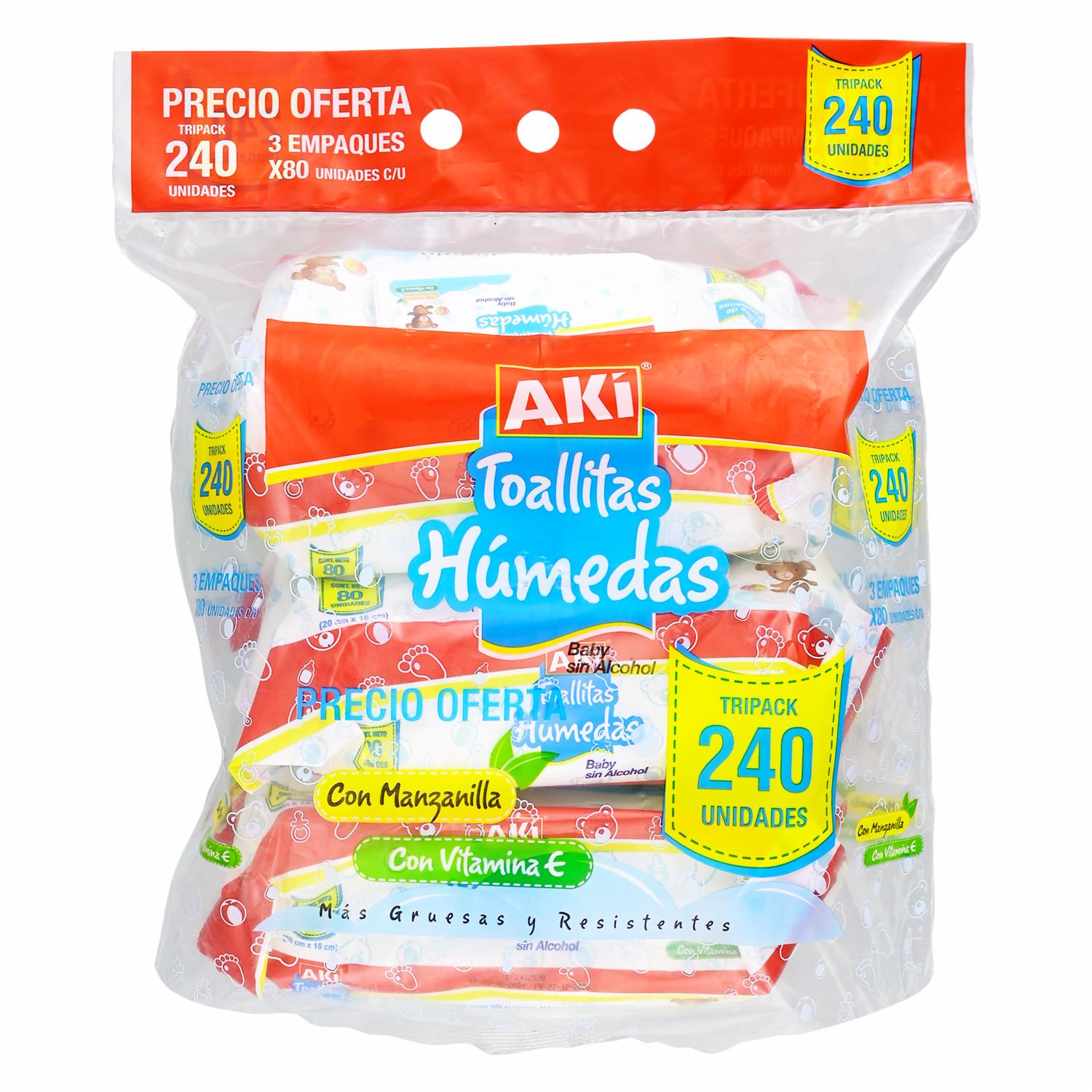 consultando preciosToallitas Húmedas Tripack AKÍ X 240 Uds – AKÍ. Disponible en nuestros locales. Precio y stock pueden variar según la tienda.