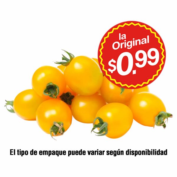 Tomate cherry amarillo, una explosión de dulzor y color en cada bocado. Perfecto para ensaladas, aperitivos y decoración de platos. El producto se entrega en presentación de funda o malla, según disponibilidad