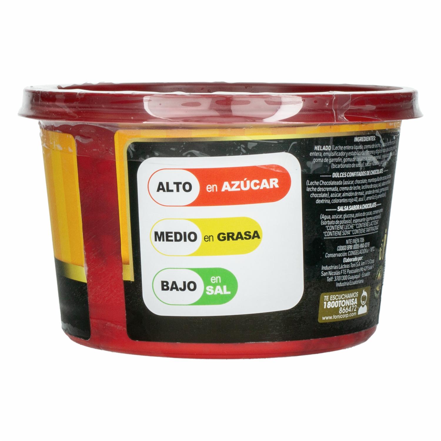 Delicioso helado nim de crema de leche sabor vainilla, con salsa sabor a chocolate y dulces confitados
