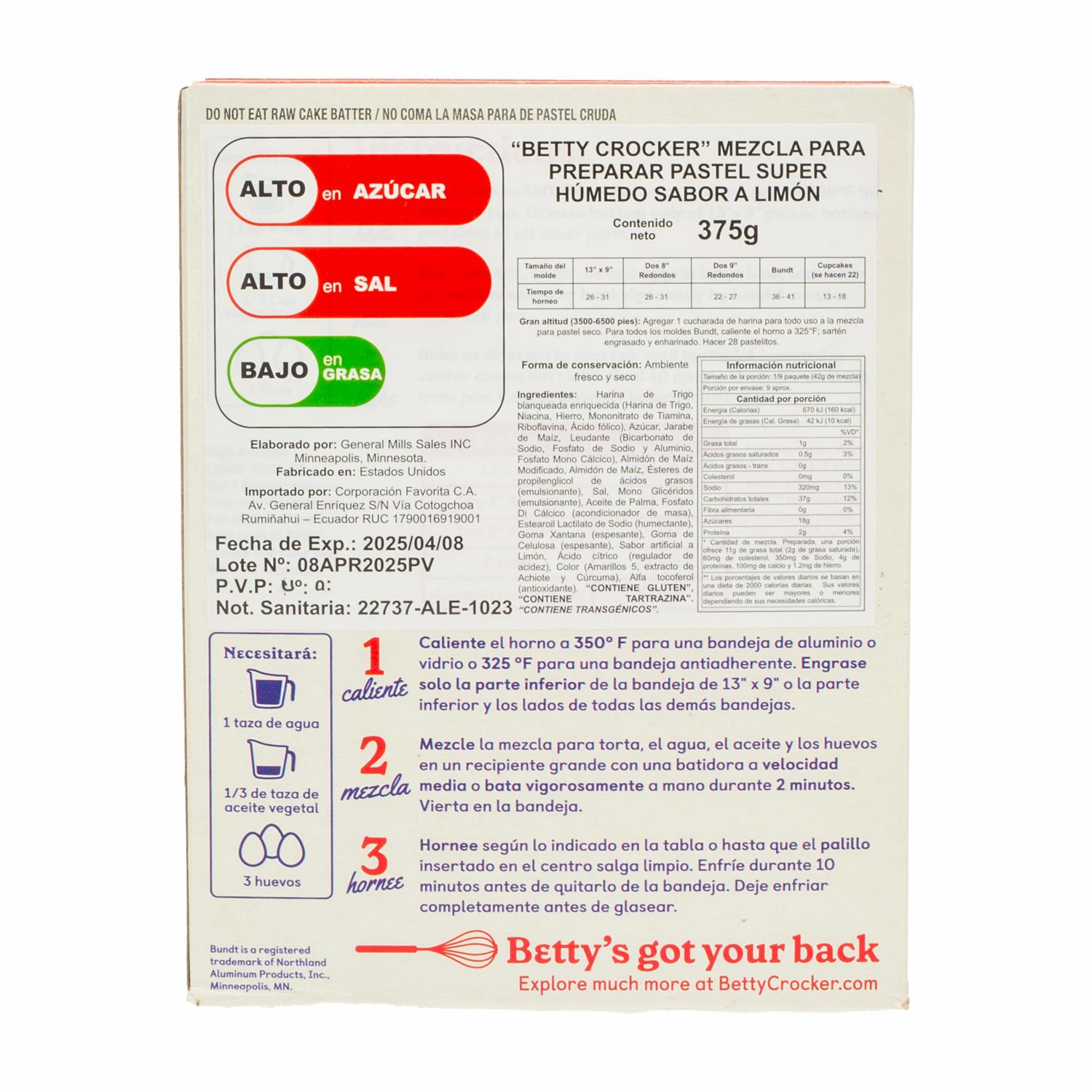 Torta Premezcla De Limón BETTY CROCKER 375 G