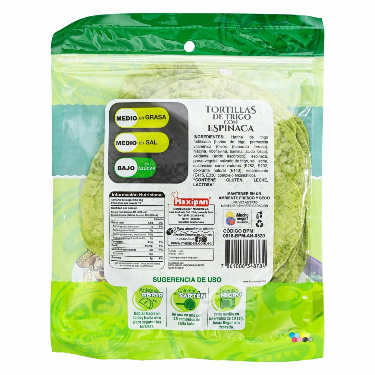 Tortillas De Trigo Con Espinaca MAXIPAN 250 G – MAXIPAN. Disponible en nuestros locales. Precio y stock pueden variar según la tienda.