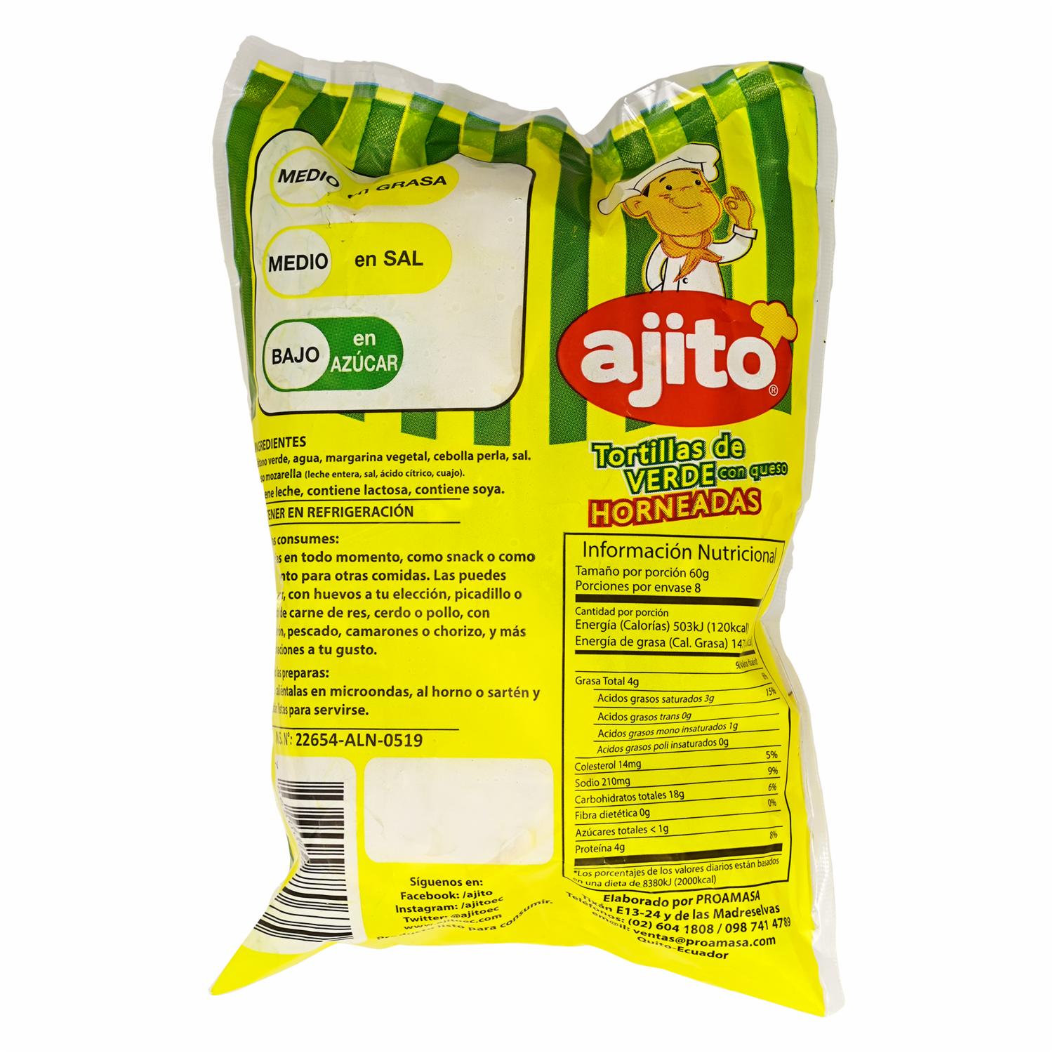 Tortillas De Verde Con Queso Horneadas AJITO 480 G – AJITO. Disponible en nuestros locales. Precio y stock pueden variar según la tienda.