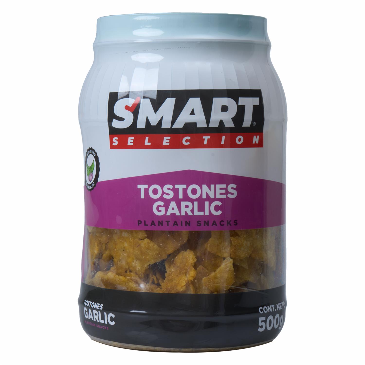 - El Tostones Garlic SMART SELECTION 500 G es un snack crujiente y delicioso, elaborado con plátano verde y sazonado con ajo, ideal para acompañar tus comidas o disfrutar como botana. Su presentación en bolsa de 500 gramos lo convierte en una opción conveniente para compartir en reuniones o tener siempre a mano en casa. Perfecto para los amantes del sabor auténtico y natural del plátano con un toque de ajo