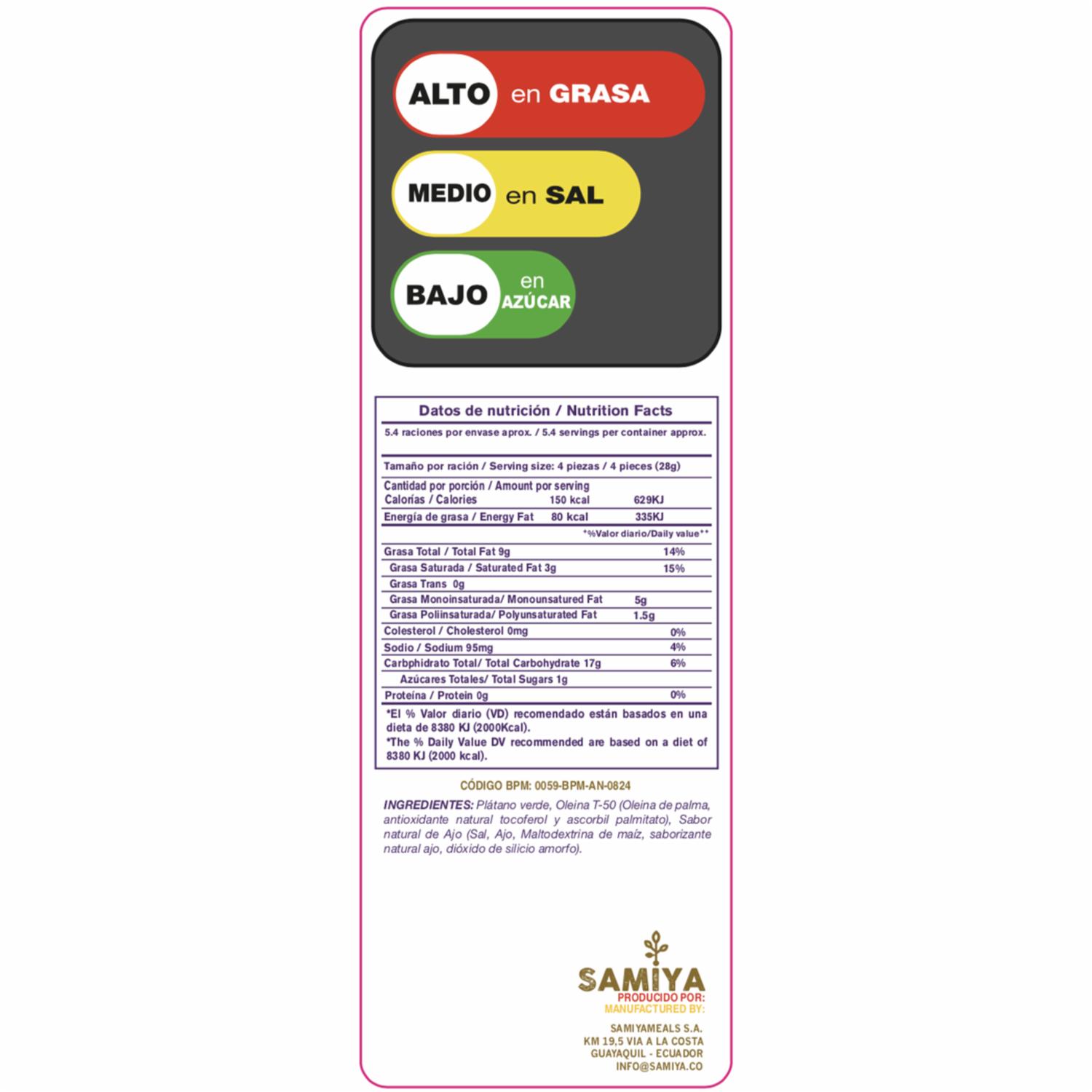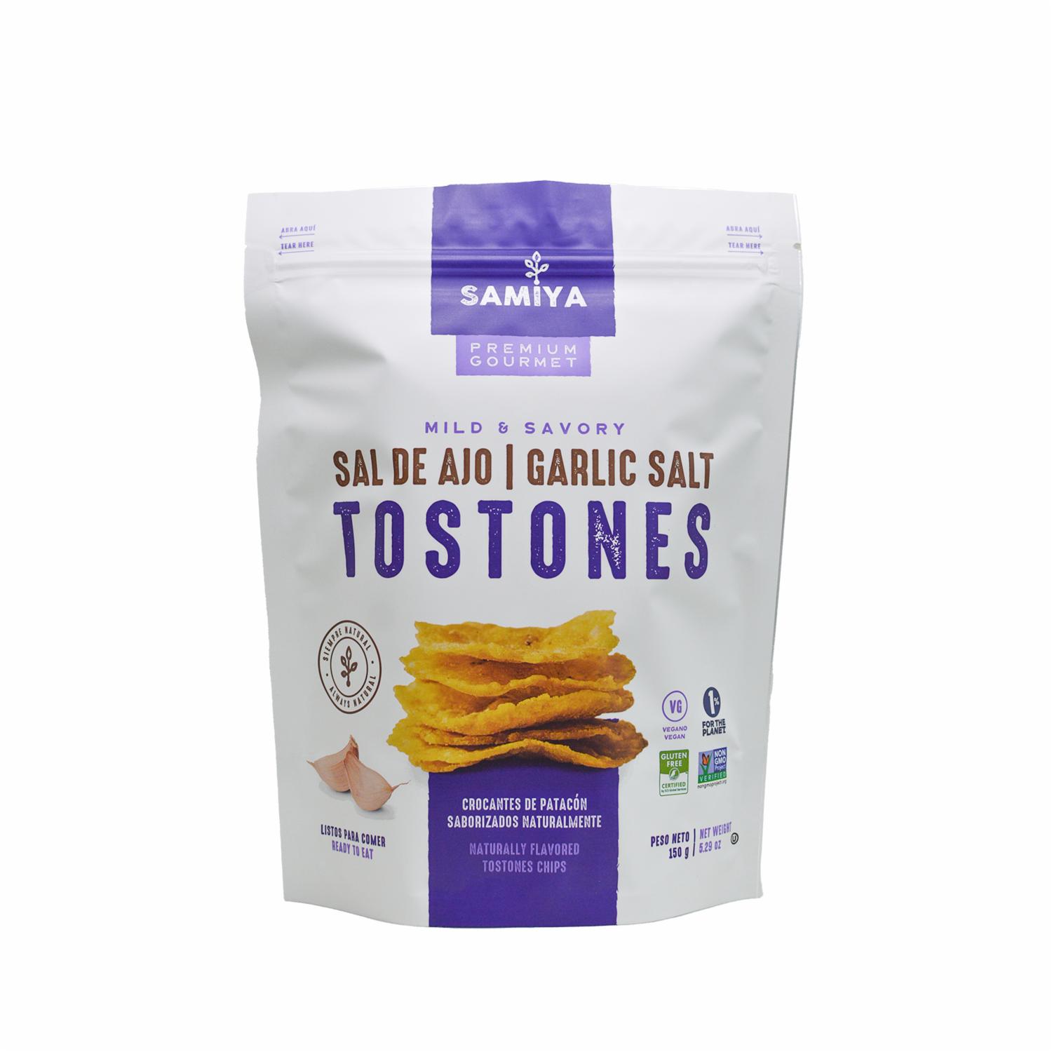 - Los Tostones Saborizados con Sal de Ajo SAMIYA son un snack delicioso y crujiente que combina la textura de los tostones tradicionales con un toque irresistible de sal de ajo. Perfectos para disfrutar en cualquier momento del día, estos tostones son ideales para acompañar tus comidas o disfrutar como aperitivo. Con un sabor único y auténtico, SAMIYA te ofrece una experiencia de snack diferente y llena de sabor