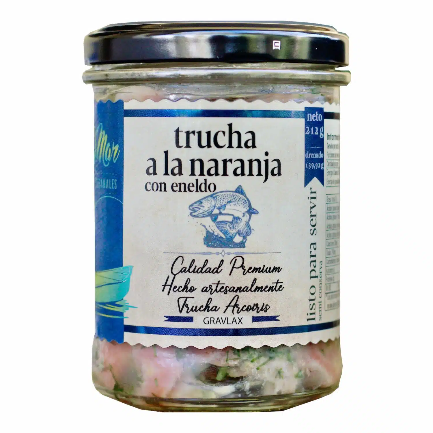 Es una conserva de Trucha con naranjas y eneldo orgánico. Estilo Gravlax. Viene en aceite girasol. Textura y sabor muy suave y tierno y jugoso. No contiene conservantes ni colorantes. Listo para comer y no requiere cocción adicional. Ideal para desayunos, sánduches, ensaladas, bagels, bruschetta